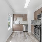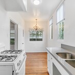 Through the dining room, we enter into the recently updated kitchen. It features stainless steel appliances, sleek new countertops and cabinetry, updated flooring, and your very own stacked washer and dryer tucked into the space. With all of those upgrades, there's still room to spare. Just add a bistro table or kitchen island to finish it off.