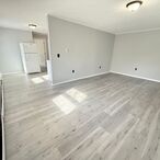 Open floor plan with kitchen, dining, and living room connected. Kitchen is well outfitted with stainless steel appliances, ample counterspace with peninsula counter seating, additional cabinets, under cabinet lighting, oak hardwood flooring and quartz countertops.