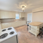 The kitchen is well-equipped with a large double basin sink, a fridge, and an oven stovetop. Ample cabinet space ensures all your storage needs are met, keeping your kitchen organized and functional.