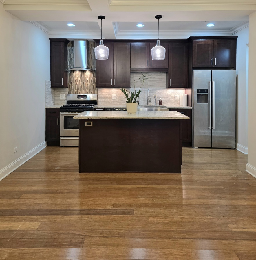 Very spacious ground floor 2 bed / 2 bath in West Loop with SS appliances, dishwasher, microwave, range hood, kitchen island, huge terrace, in-unit laundry. Gym and rooftop deck on-site