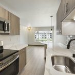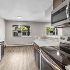 The modern kitchen, featuring sleek stainless steel appliances and quartz countertops, is ready for all your culinary adventures. In-unit laundry means no interruptions to your routine, and the newly extended patio provides the perfect spot to recharge.