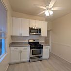 The kitchen is small with custom wood cabinets, granite counter tops, microwave hood, flat top electric stove. The 24" refrigerator is included.