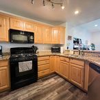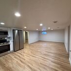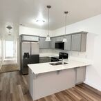 The heart of the home is the stylish kitchen, equipped with modern appliances and a stunning wrap-around stone countertop with bar seating—perfect for casual meals and entertaining. Rich wood cabinets add a touch of sophistication, flowing seamlessly into the spacious living area with laminate wood floors.