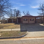 No garage, but includes a covered two-car carport and extended driveway parking. Large fully fenced backyard with mature tree, storm shelter, and storage shed.