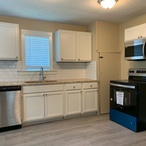 This beautifully updated 2-bedroom, 1-bathroom home is now available for rent! Inside, you'll find sleek vinyl flooring throughout, paired with crisp white walls, doors, and trim for a clean, modern look. The bathroom offers marble tile floors, a white vanity, and a classic shower-tub combo. The kitchen features stylish black appliances and countertops that provide a striking contrast.
