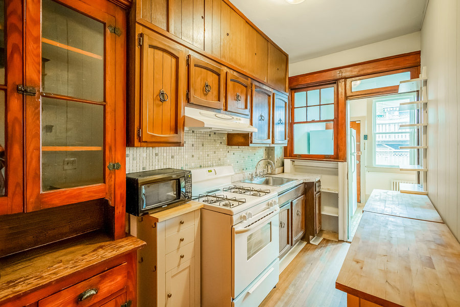 4BR layout with attached English basement, additional living area + kitchenette, original woodwork, hardwood floors, front porch, private yard space, and rear parking included.