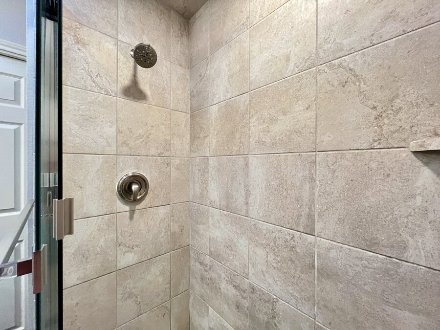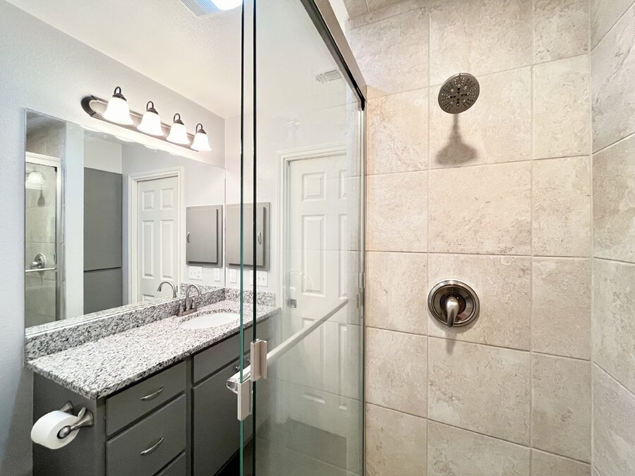 The primary bedroom is a peaceful retreat with vaulted ceilings, a walk-in closet, and an ensuite primary bath complete with a walk-in shower. Additional features include vinyl flooring, ceiling fans, blinds, and window coverings throughout the home. For added comfort, the home is equipped with air conditioning, gas heat, and a programmable thermostat.