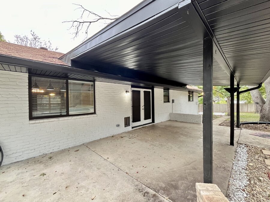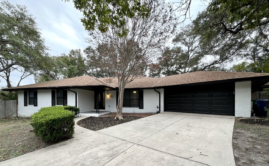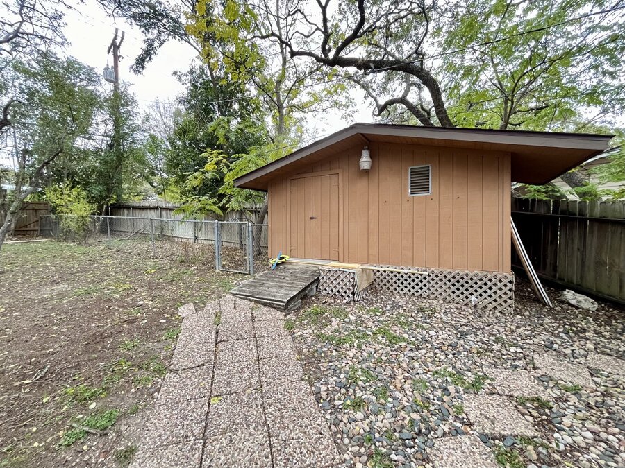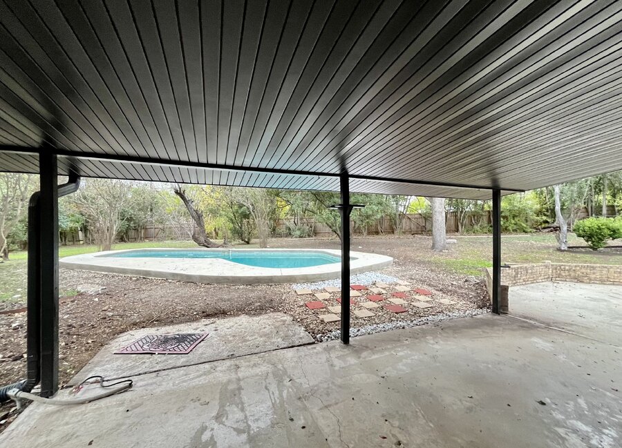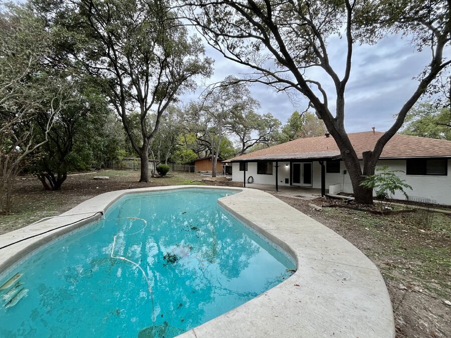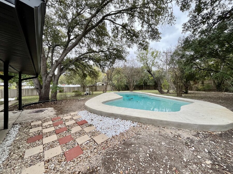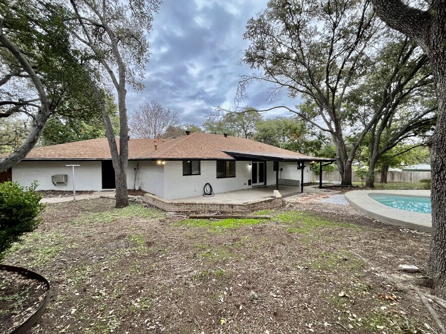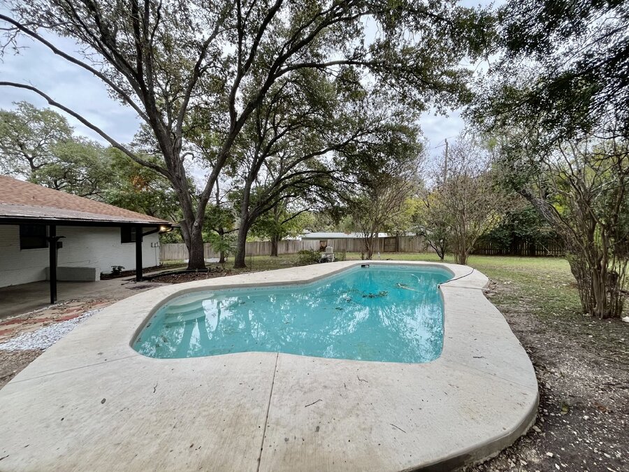 Step outside to the covered patio overlooking a pool area, with a mix privacy fence/chainlink fance and mature trees offering a tranquil setting. The property is situated on a cul-de-sac and boasts a fenced backyard, perfect for outdoor activities. A storage shed provides extra space for tools or equipment, and the attached garage comes with a door opener for convenience.