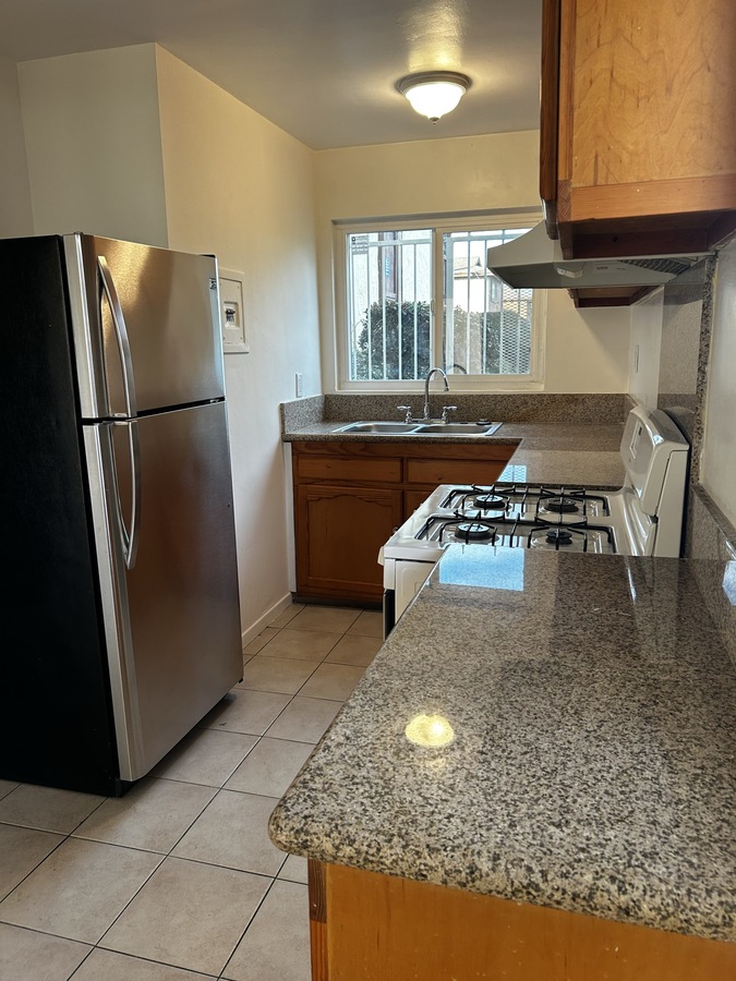 The kitchen features warm wood cabinetry, granite countertops, and modern appliances, including a gas stove and refrigerator. With ample storage and counter space, meal preparation is a breeze. A large window above the sink fills the room with natural light, making the space both bright and inviting.
