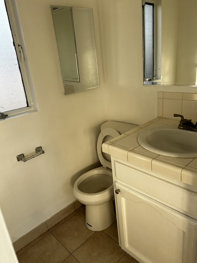 The bathroom is thoughtfully designed with a tiled vanity, spacious mirror, and a combination bathtub and shower. Clean and functional, it meets all your daily needs with ease.