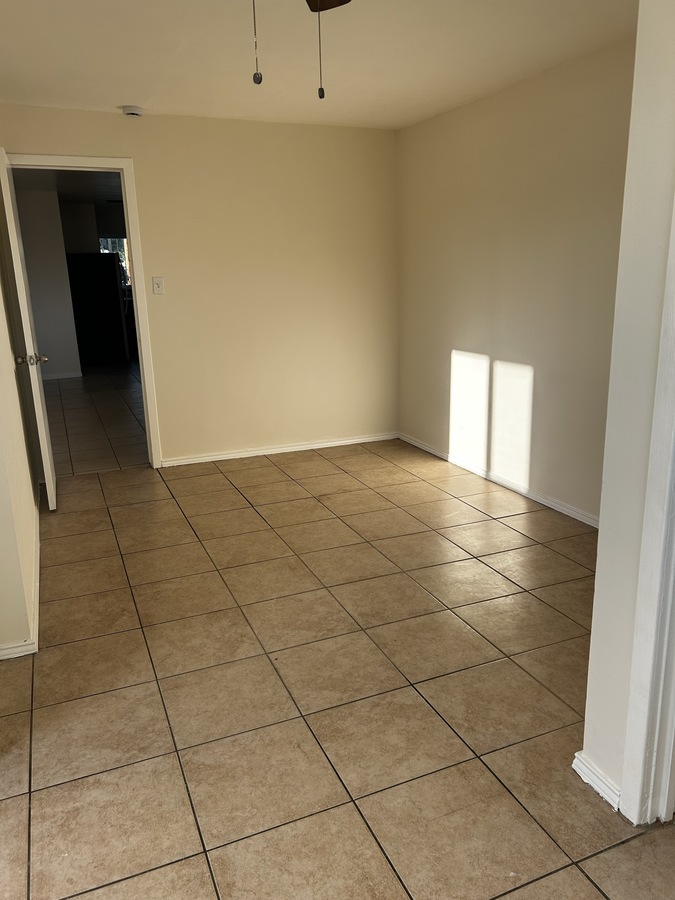 The open-concept living and dining areas are ideal for entertaining or relaxing. Tile flooring throughout provides easy maintenance, while large windows flood the space with sunlight. A ceiling fan in the living area enhances comfort, ensuring a cozy atmosphere year-round.