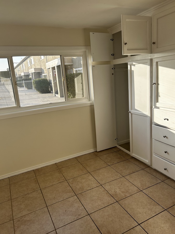 This unit boasts a generously sized bedroom, featuring built-in closets with overhead cabinetry for ample storage. The large windows create a bright, airy feel, perfect for unwinding at the end of the day.