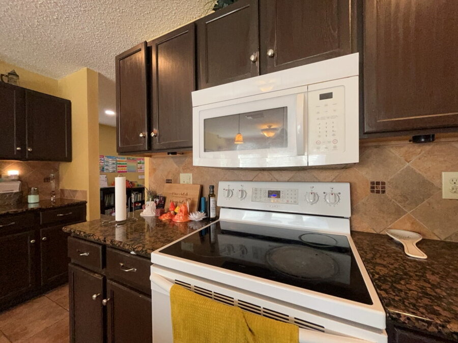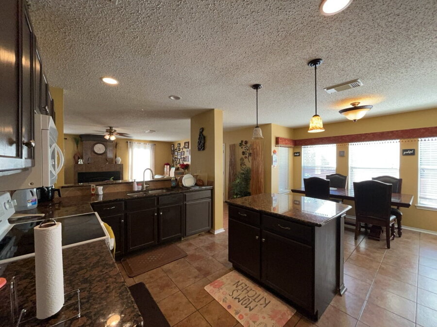 Stylish ceramic tile and vinyl flooring flow throughout and a cozy fireplace adds a warm focal point to the main living space. The kitchen is both practical and welcoming, featuring an eat-in layout, electric stove, island, refrigerator and microwave ideal for casual meals or entertaining guests.