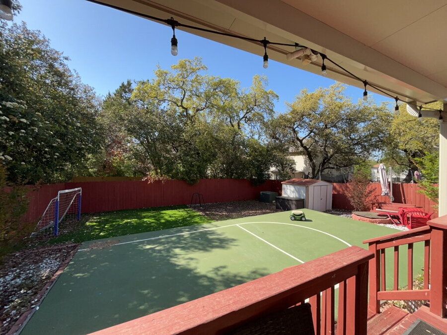 Step outside to enjoy a fenced backyard with a covered porch, gutters, and a storage shed great for keeping things organized while enjoying your outdoor space.