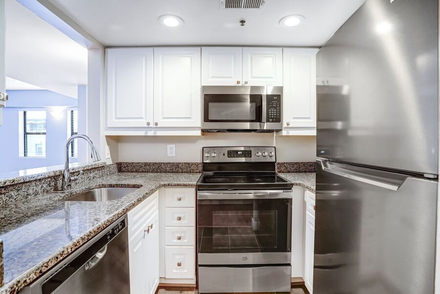 Ideally situated between Dupont Circle and U Street in an impressive Art Deco Building, this sun-drenched one-bedroom condo cannot be beaten. The open living room and sunny dining room with custom light fixtures are perfect for entertaining guests with a great view. The kitchen has marble countertops and stainless steel appliances. Prepare gourmet meals with ease, and savor them in the adjacent living + dining area, perfect for hosting intimate gatherings or enjoying family meals.