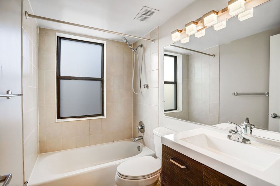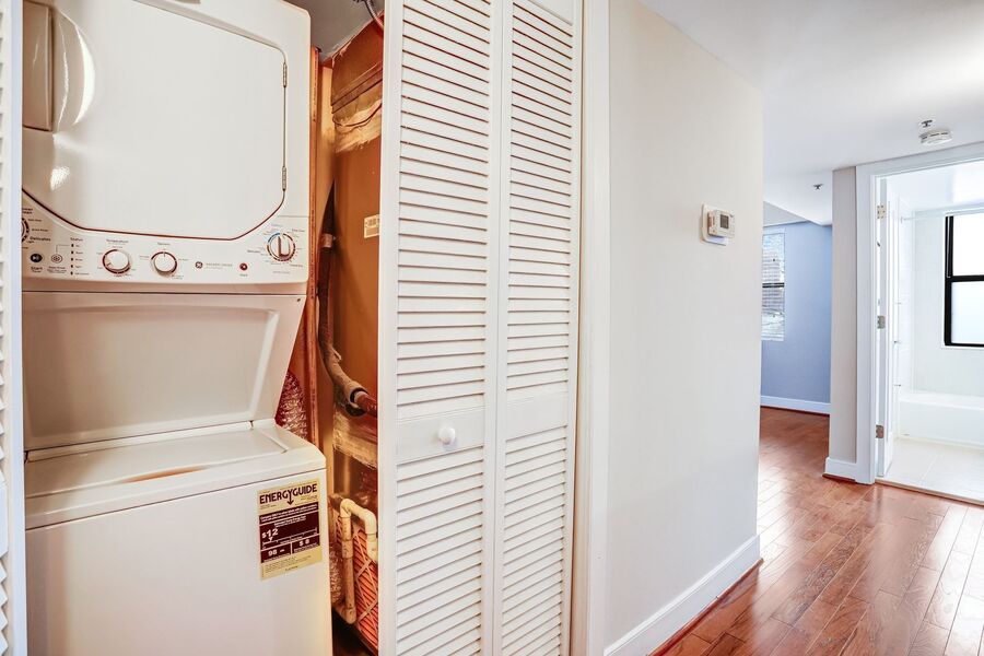 The bedroom is spacious with lots of natural light and features plenty of closet space. The main bathroom features a modern vanity with spacious counter space and a shower tub. The unit includes a full-size stackable washer and dryer and tons of extra storage. The building is equipped with an elevator!