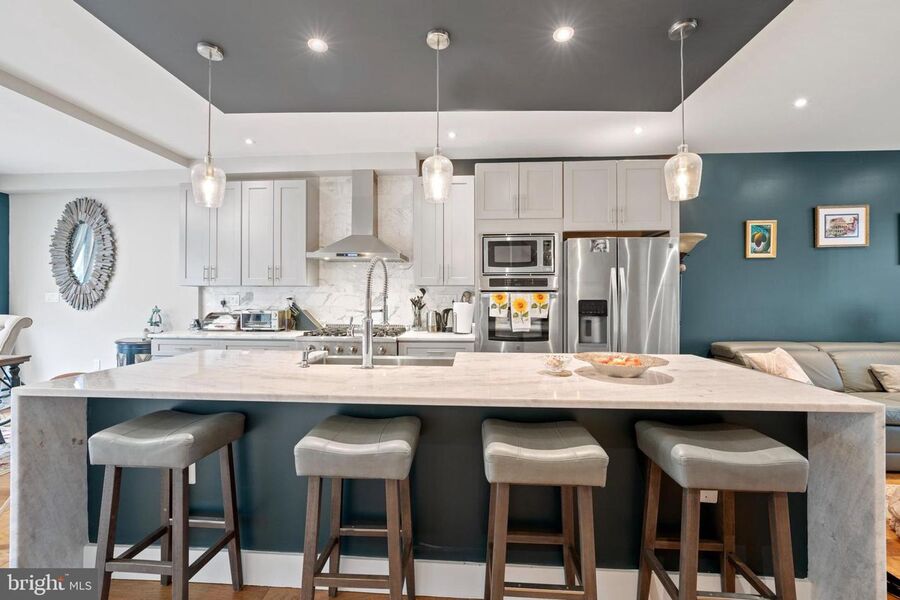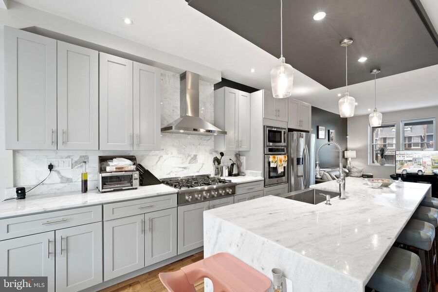Luxury kitchen with Carrera countertops, a huge island plus high-end stainless steel appliances