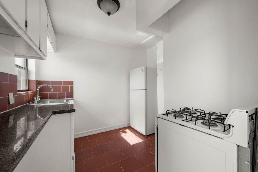 The apartment is equipped with a fridge, a stove with an oven, and a wall AC unit for your convenience.