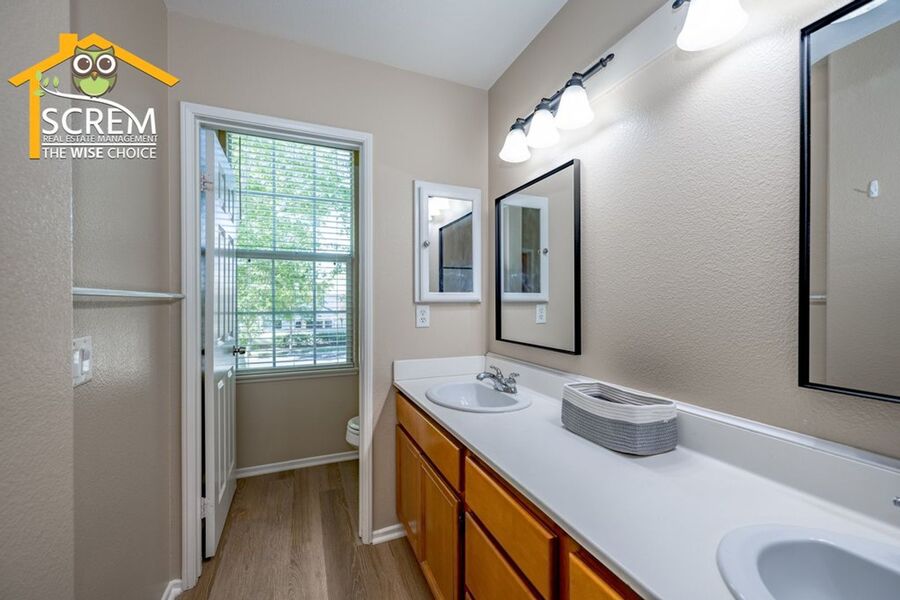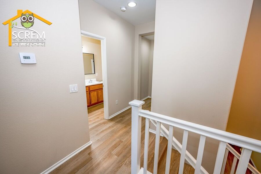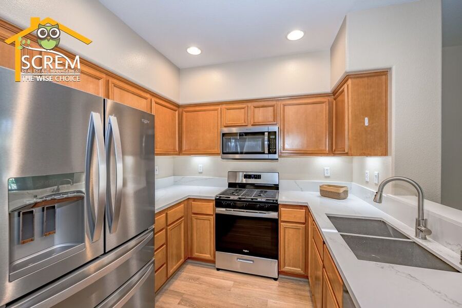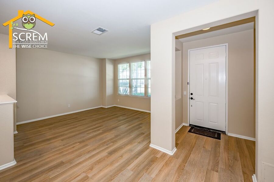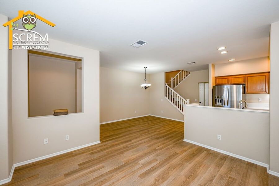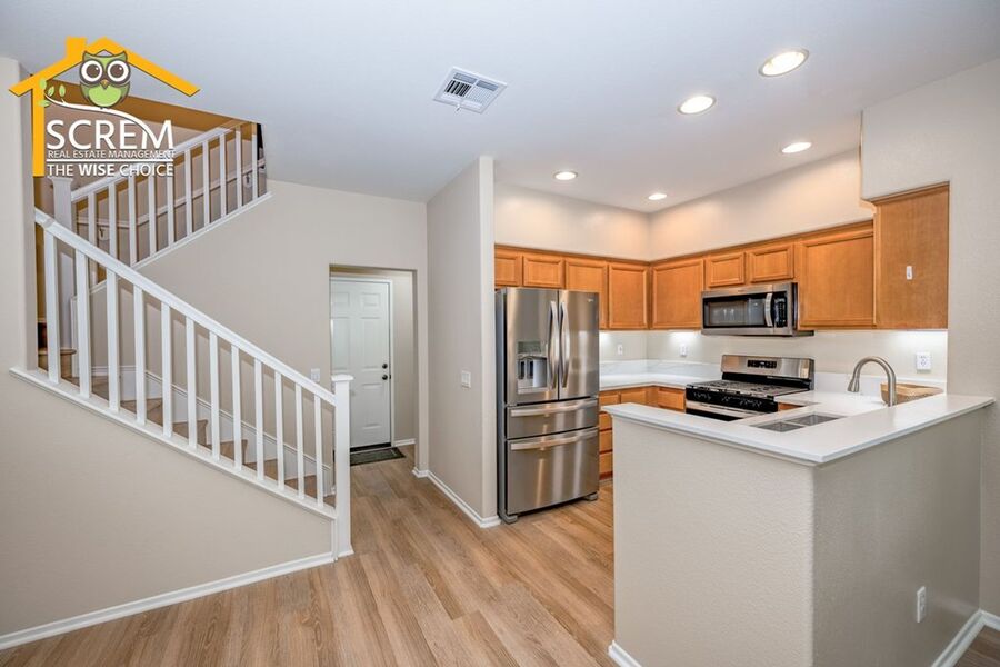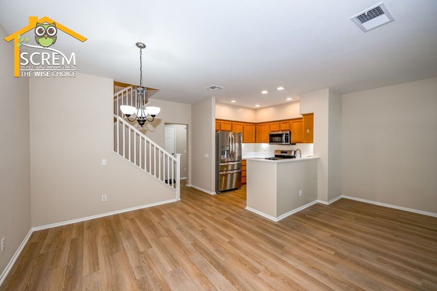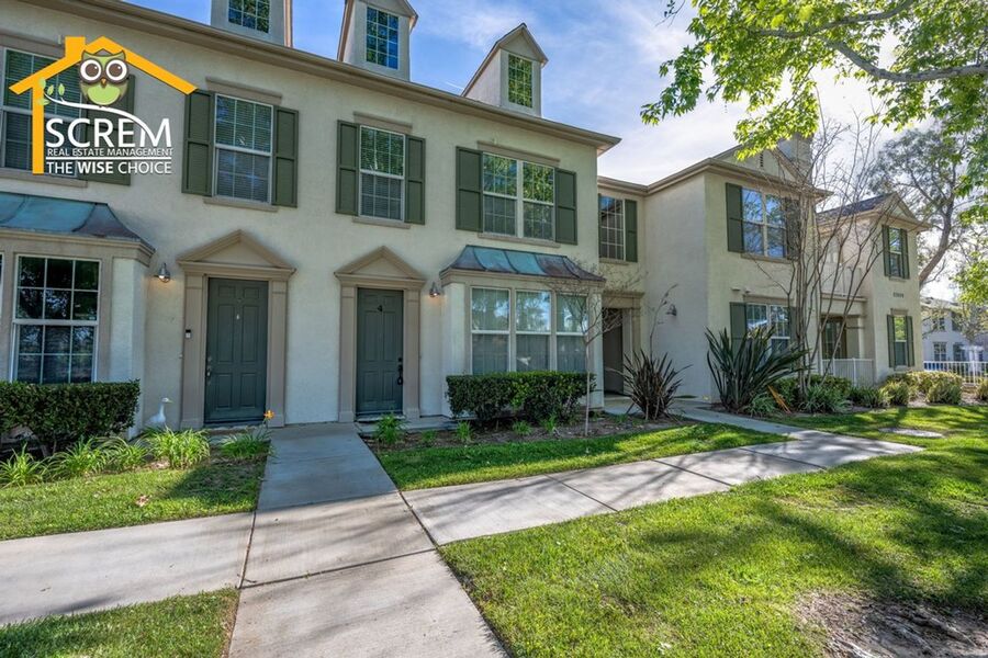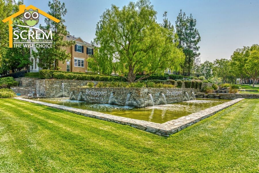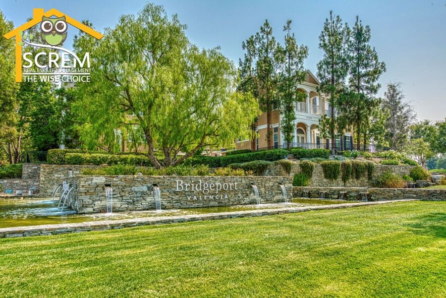This beautifully updated three-bedroom townhouse is located in the desirable Bridgeport community of Valencia. The inviting entry opens to a bright, open concept living space that combines the living room, dining area, and kitchen, all featuring high ceilings and plenty of natural light. The updated kitchen features granite countertops, recessed and under-cabinet lighting, and new stainless steel appliances, including a gas stove, single oven, microwave, dishwasher, and refrigerator. A convenient half bathroom with a pedestal sink is also located on the ground floor. Upstairs, the spacious primary suite boasts a ceiling fan, a walk-in closet, and an attached private bathroom with dual sinks. There are two additional guest bedrooms, each equipped with a ceiling fan and a walk-in closet. Full guest bathroom that also features dual sinks. A stackable washer and dryer are conveniently located in the laundry closet upstairs. Additional highlights of this home include an attached two-car garage, fresh paint, and new flooring throughout, creating a clean, modern feel. Enjoy all the Bridgeport amenities, including a lake with a walking path, an HOA pool and spa overlooking the lake, a barbeque area, and an outdoor fireplace. *Owner may consider a small pet.