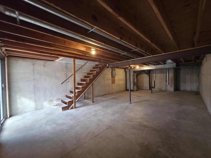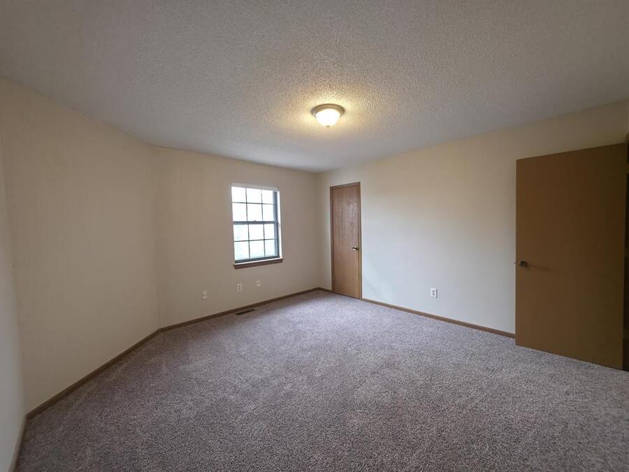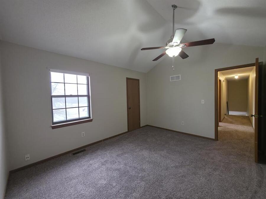 The primary bedroom boasts vaulted ceilings, a ceiling fan, new carpet, and a large walk-in closet. Two additional bedrooms offer ample space with new carpet and generous closet storage. The main bathroom features LVP floors and an extra-large vanity, while a convenient half bath serves guests. Additional amenities include washer/dryer hookups, central heat and air, a 1-car garage, and an unfinished walk-out basement providing extra storage space.