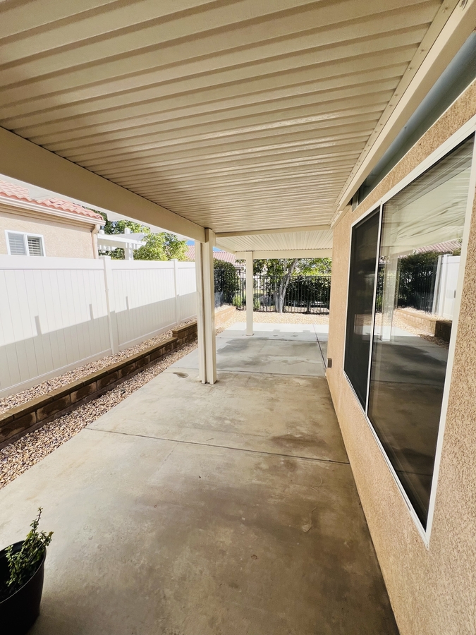 The backyard is designed for low maintenance, featuring a covered patio and wraparound concrete space that works well for outdoor seating or dining. Sliding glass doors provide easy access from the living area, making the space feel connected and open.