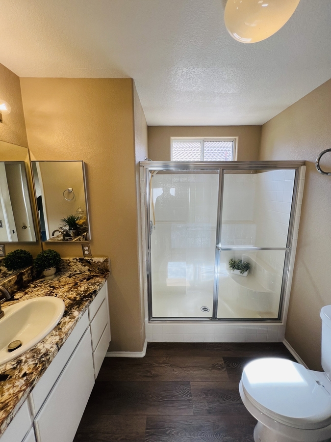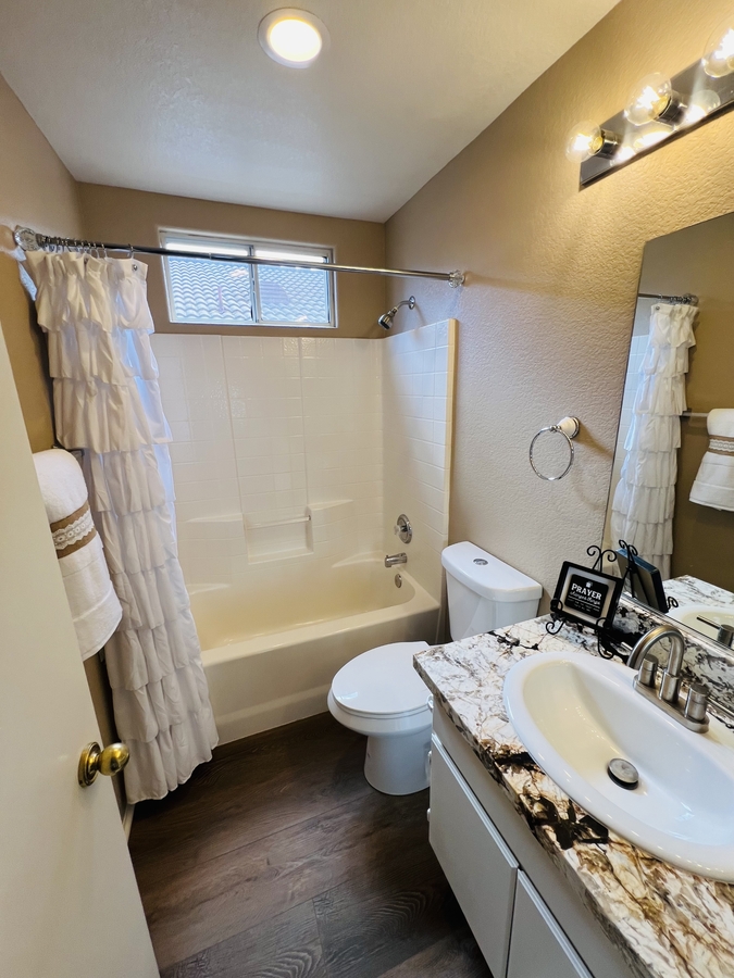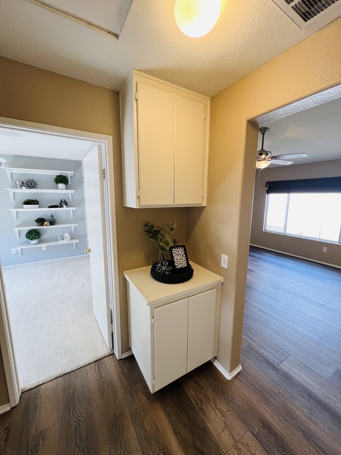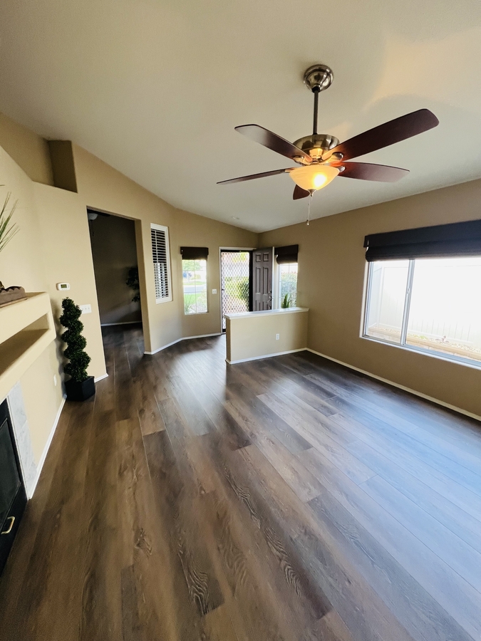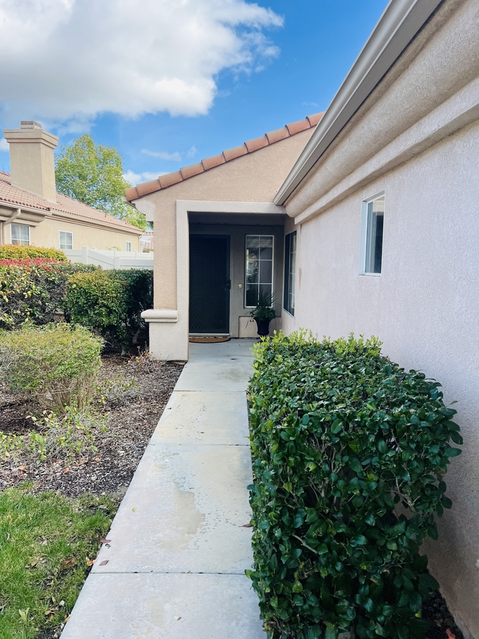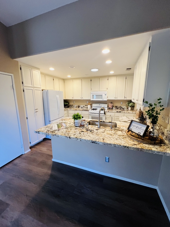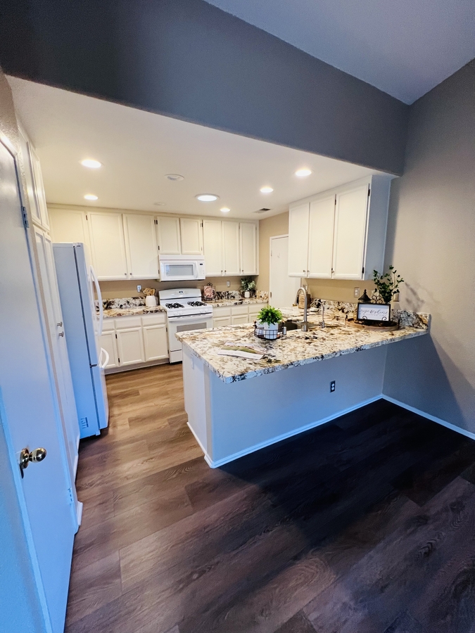 Located in the SENIOR 55+ gated community of The Colony in Murrieta, this single-story home offers a bright and functional layout with comfortable indoor and outdoor living. The interior features laminate flooring, neutral tones, and an open floor plan that connects the kitchen, dining, and living areas. The kitchen is equipped with granite countertops, white cabinetry, a pantry for extra storage, and a counter bar for casual dining, along with direct access to the garage for added convenience.