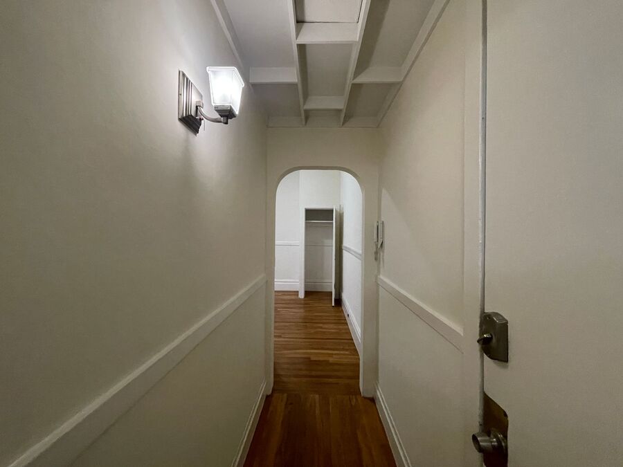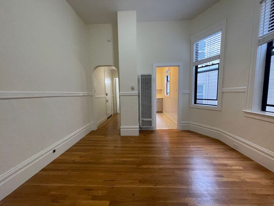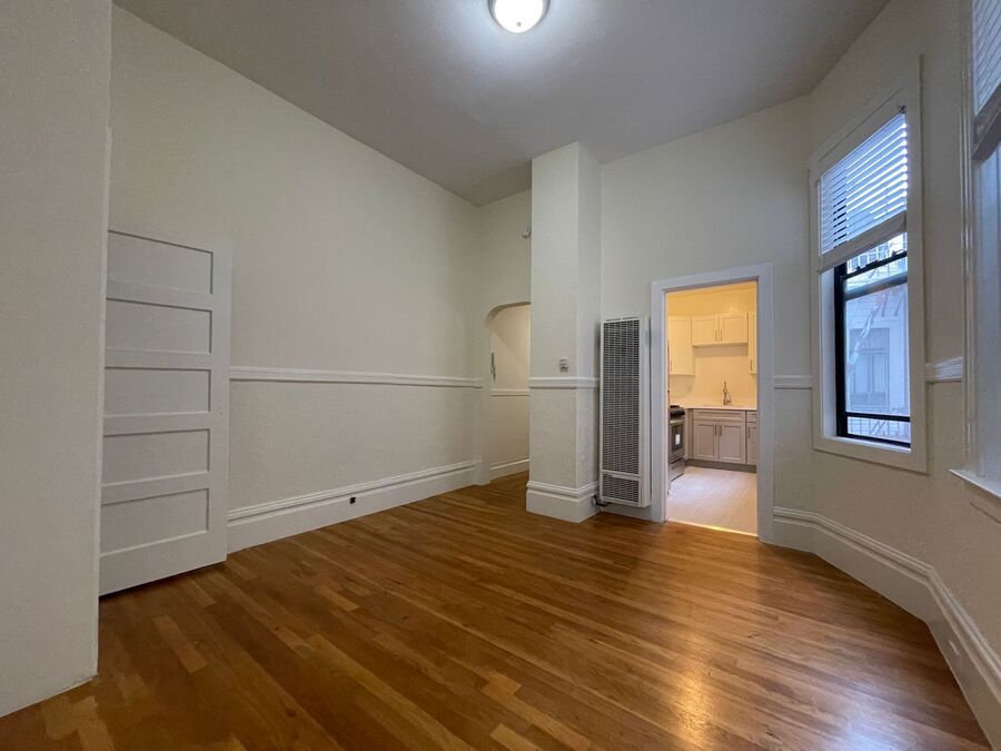 This charming studio is a must see! Its petite layout offers a sizable main room, cozy, newly remodeled kitchen and updated bathroom with shower. The kitchen offers many cabinets and a gas stove. The unit boasts high ceilings, large windows and hardwood floors. Be sure to make time to take a tour! The buildings common areas have tons of San Francisco charm with original intricate ceiling decor and is situated directly across from Lafayette Park. Enjoy tennis, views of the city or blanket in the grass during a beautiful SF day!