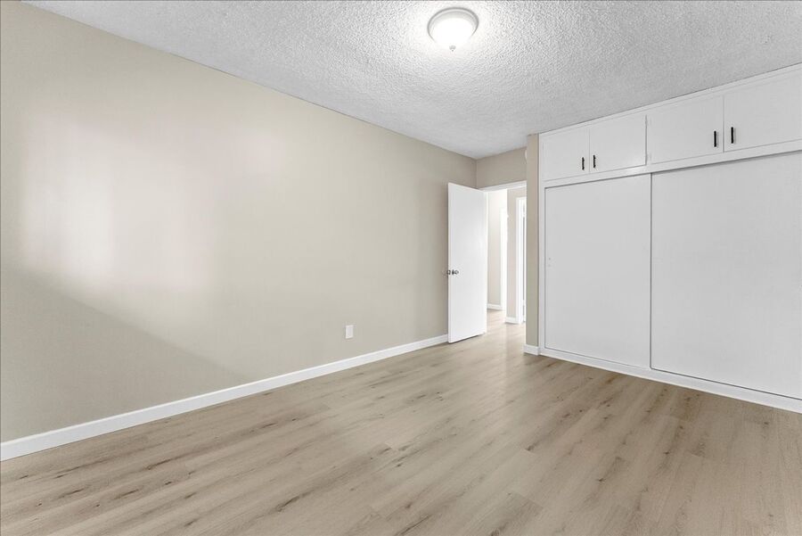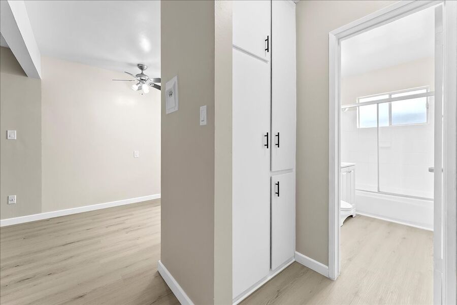 Fresh new floors flow throughout, complemented by ceiling fans for breezy comfort and wall heat for cozy evenings. A convenient hallway storage closet sits just outside the bathroom, making organization easy. Both bedrooms are generously sized and offer built-in closets with upper storage cabinets, giving you all the space you need without sacrificing style.