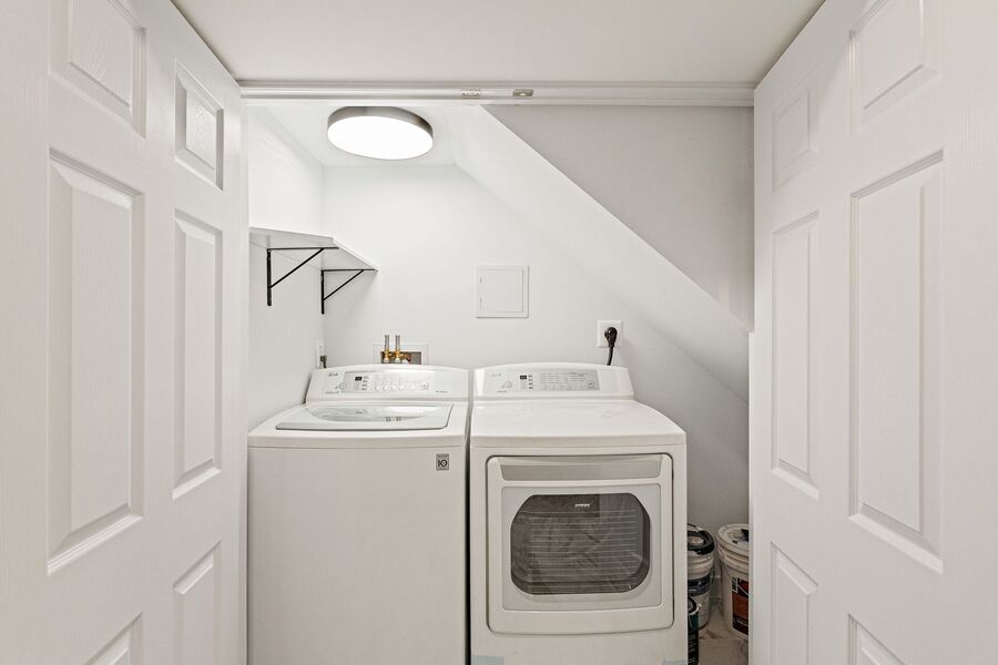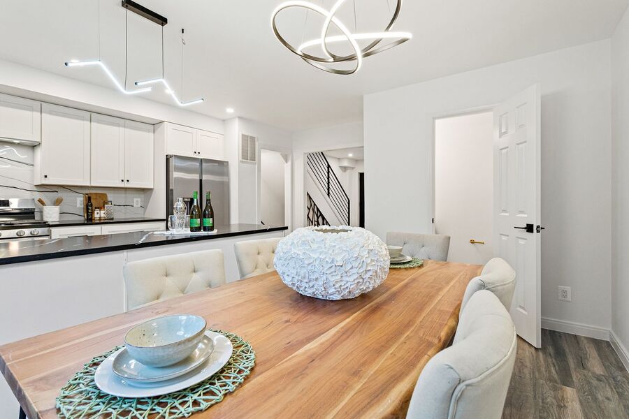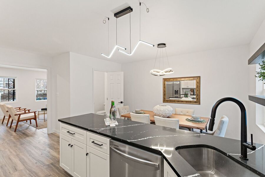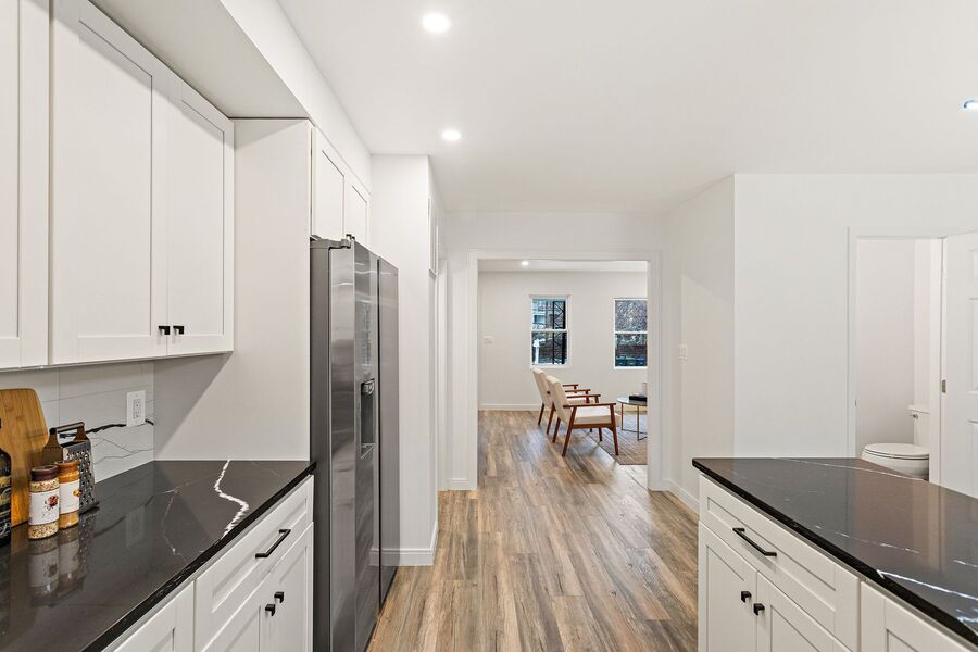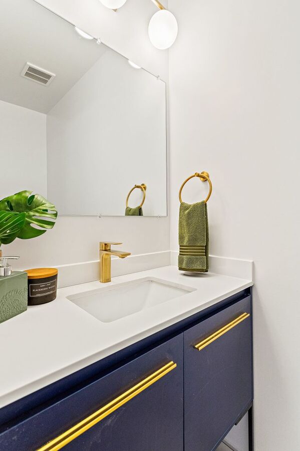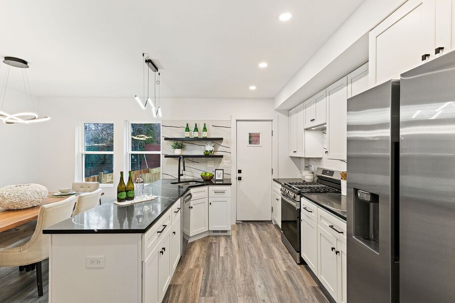 • Spacious kitchen with nice blue cabinet storage, breakfast bar, and stainless steel appliances