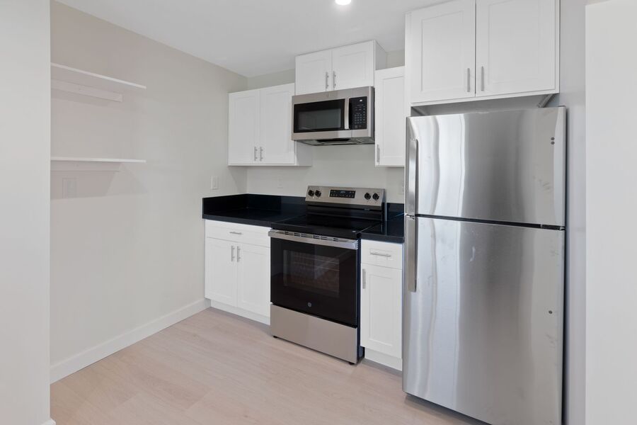 The kitchen is equipped with brand new stainless steel appliances, offering a clean, modern look with everyday convenience.