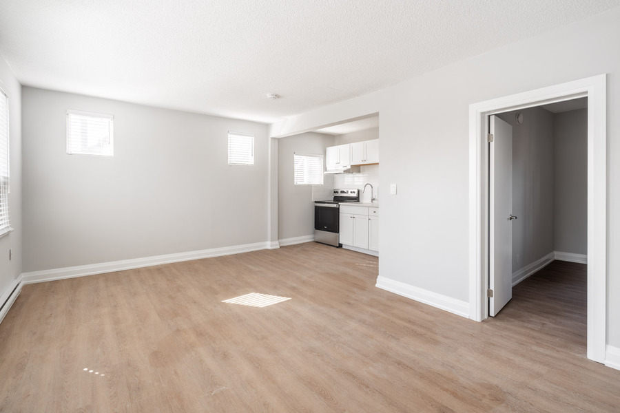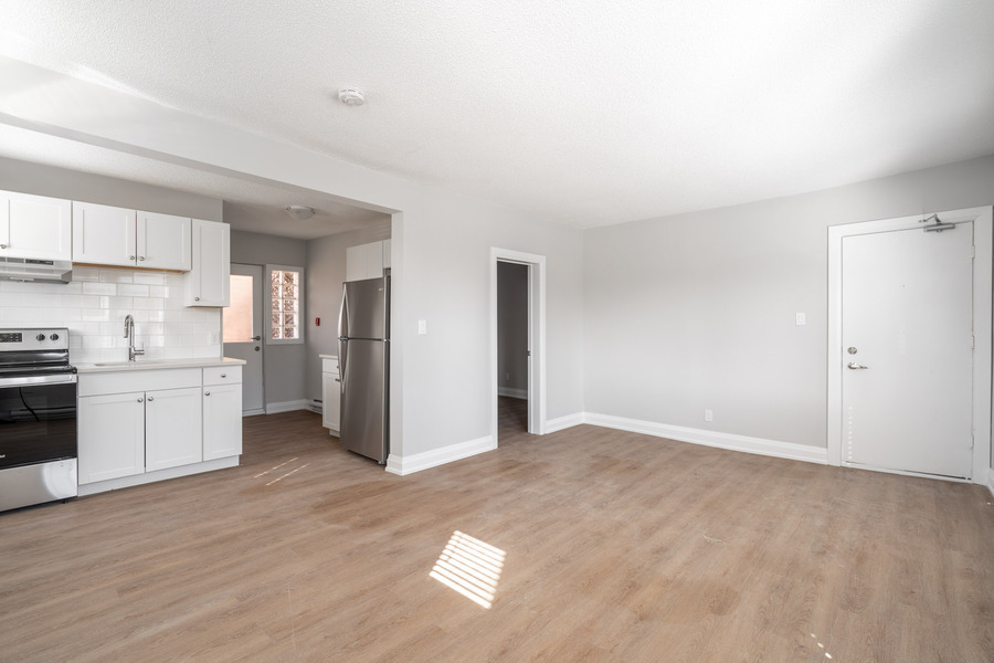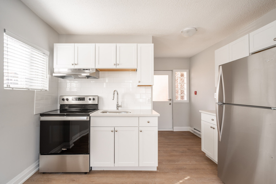 The open-concept living area gives you flexibility to set up your space, whether for entertaining, relaxing, or creating a dedicated home office. The modern white kitchen features stainless steel appliances, white subway tile backsplash, and direct access to a private balconyperfect for enjoying your morning coffee or unwinding at the end of the day.