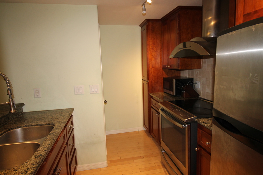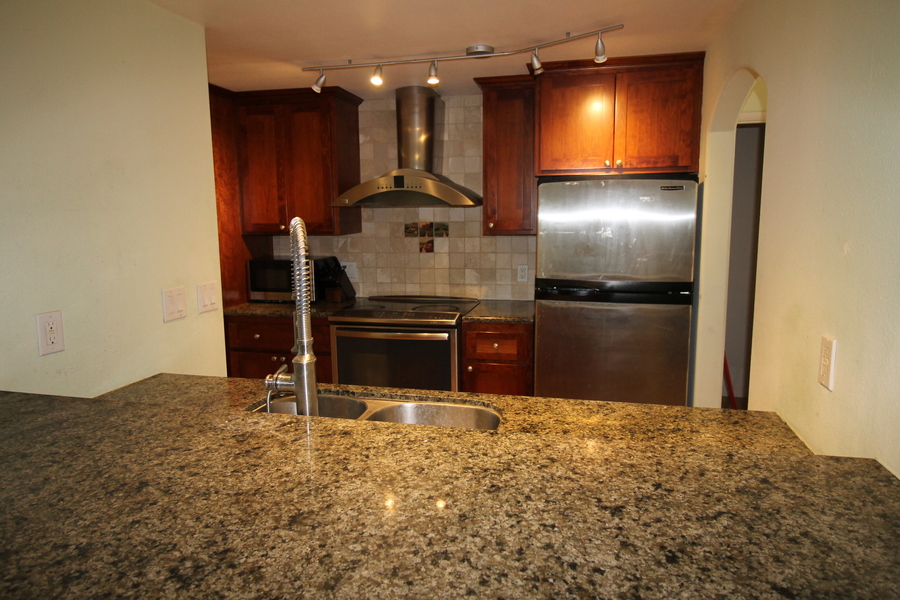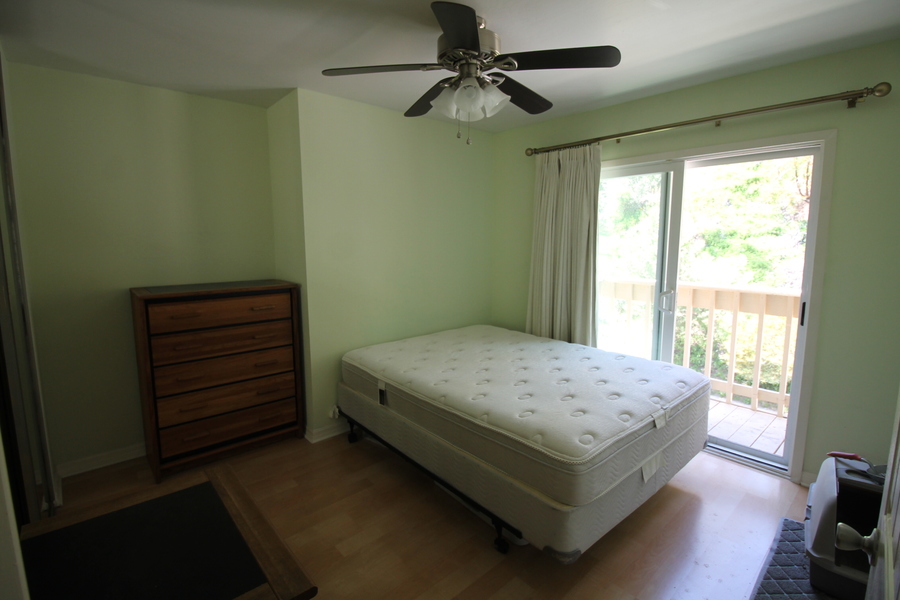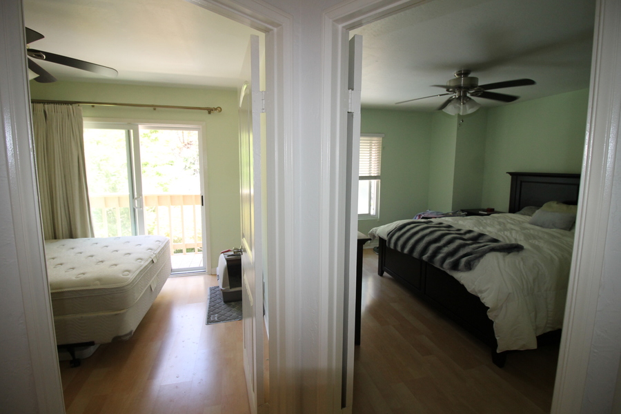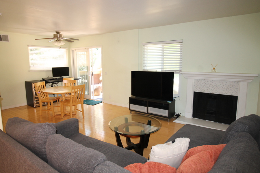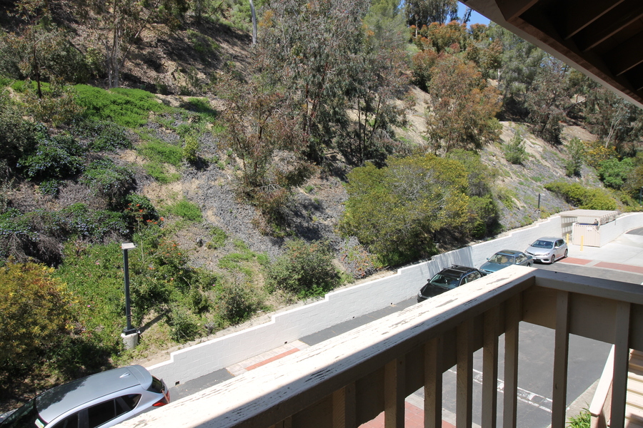 End unit townhome in La Jolla Colony with a large balcony overlooking the hillside. 2 car attached garage with a half bath on the second floor with the kitchen and living area. Both bedrooms are on the top floor with a walk in closet in the primary bedroom.