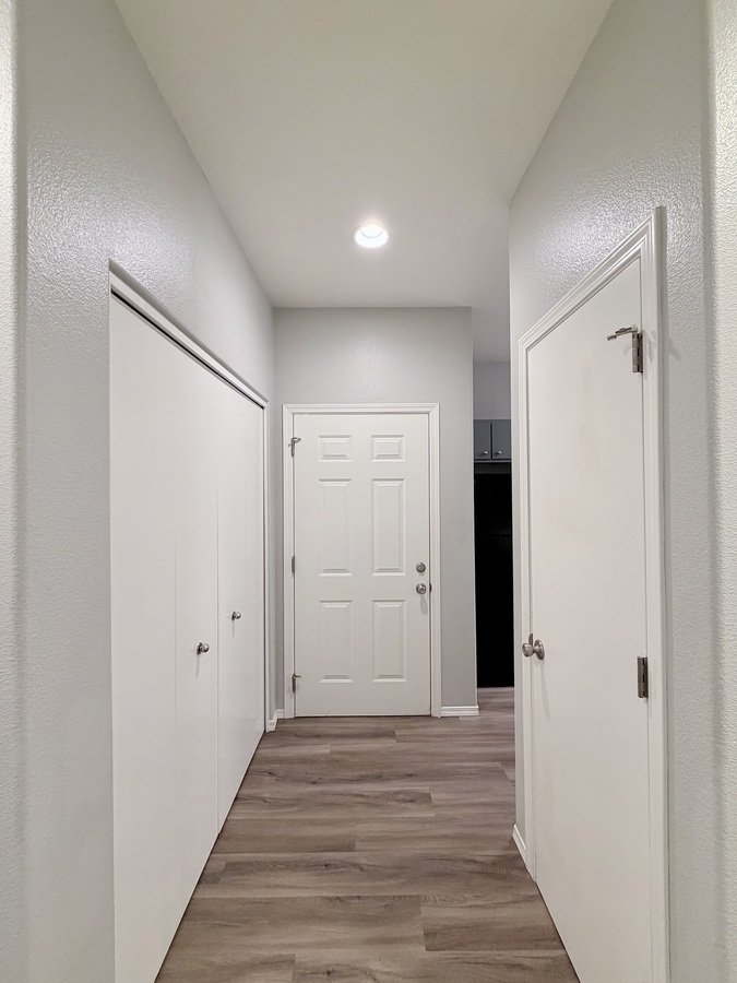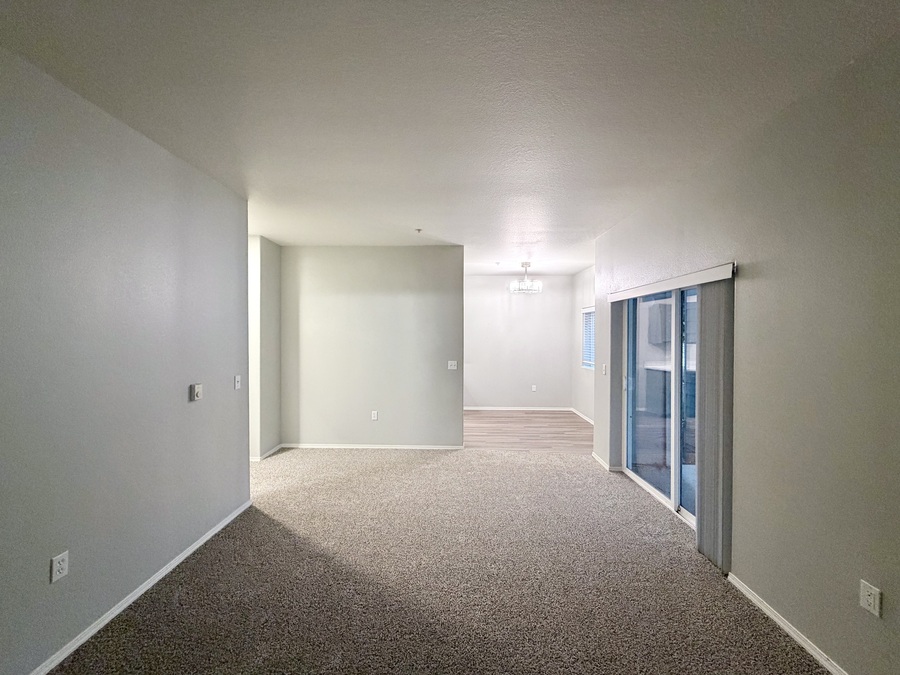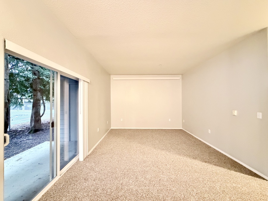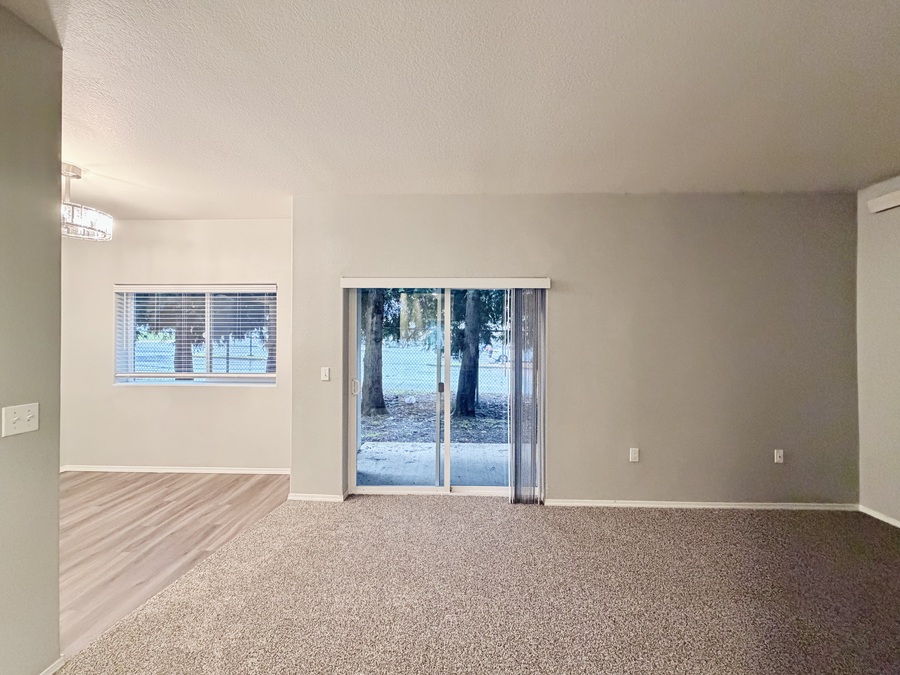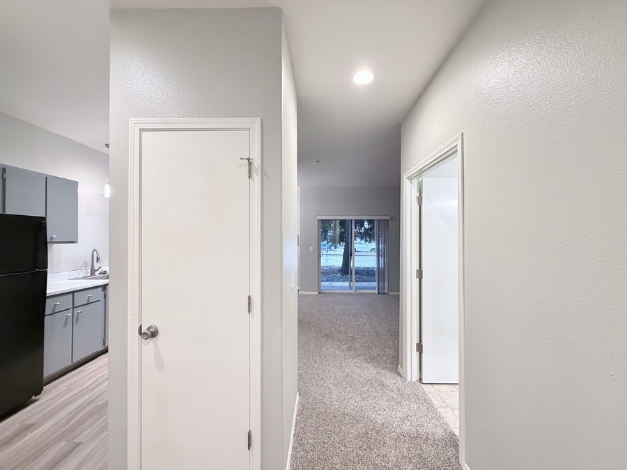 The open layout continues into the living room, where a sliding glass door leads to your private patio—complete with a generously sized storage closet, perfect for added convenience. Down the hall, the shared bathroom has been thoughtfully updated to match the home’s modern feel.