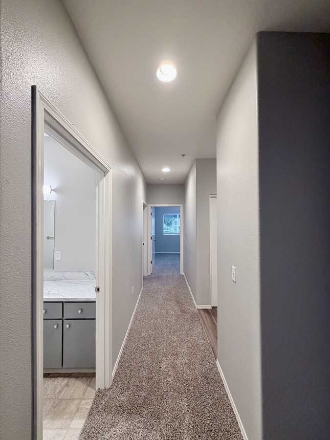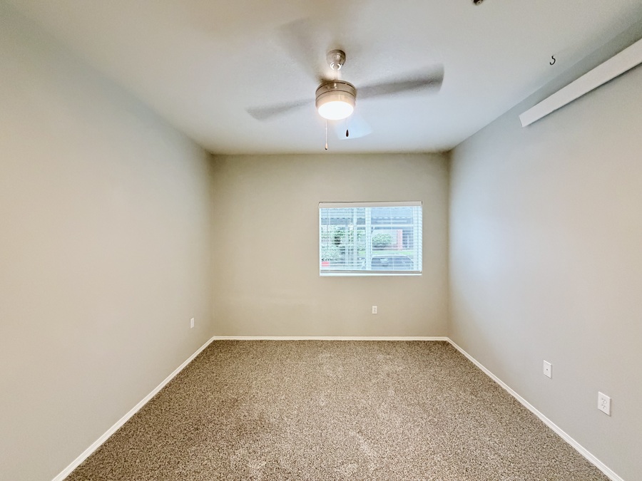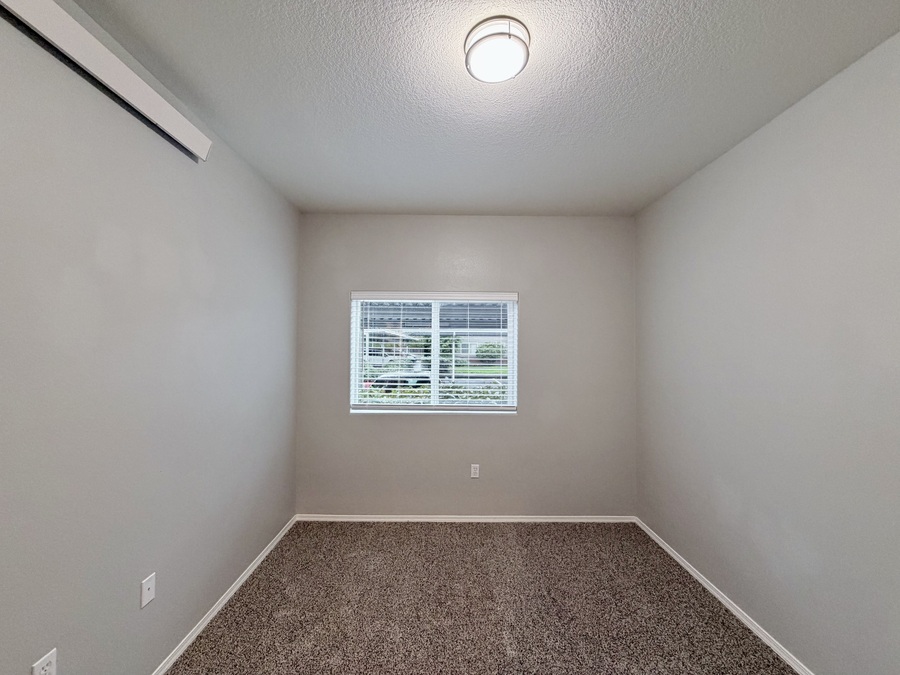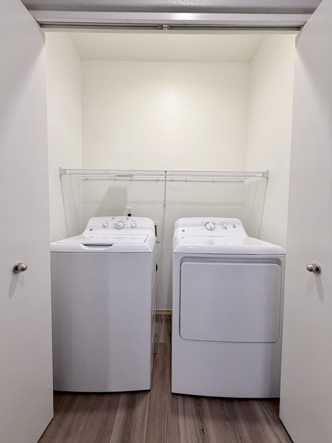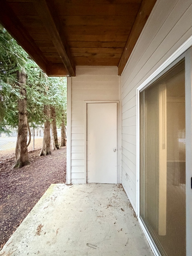 The open layout continues into the living room, where a sliding glass door leads to your private patio—complete with a generously sized storage closet, perfect for added convenience. Down the hall, the shared bathroom has been thoughtfully updated to match the home’s modern feel.