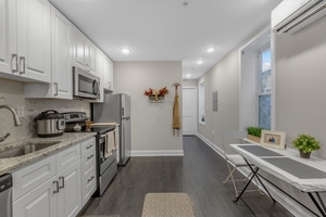 Welcome to 3965 Lancaster Ave #104! This 1 bedroom, 1 bathroom unit offers stylish city living with modern conveniences throughout. The open floor plan creates a seamless flow through the common area, highlighted by laminate flooring and recessed lighting that span the length of the space. The kitchen features white shaker cabinets, a classic subway tile backsplash, and counter seating, along with a full range of stainless steel appliances including an electric stove, refrigerator, dishwasher, and microwave. The nicely sized bedroom includes a built-in closet system and direct access to a sleek, modern ensuite bathroom with tile flooring, a contemporary vanity, and a tiled shower. Additional features include central air, in-unit laundry, and an intercom security system for added peace of mind. With gorgeous finishes and a thoughtfully designed layout, this unit has everything you need for comfortable, stylish living. Schedule your showing today!