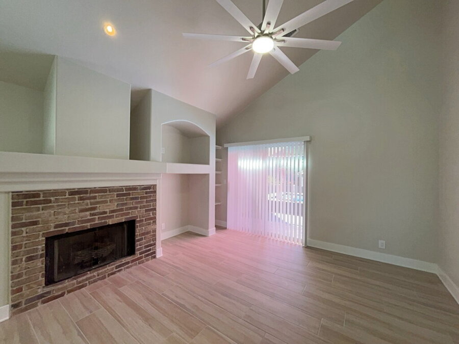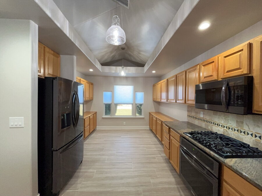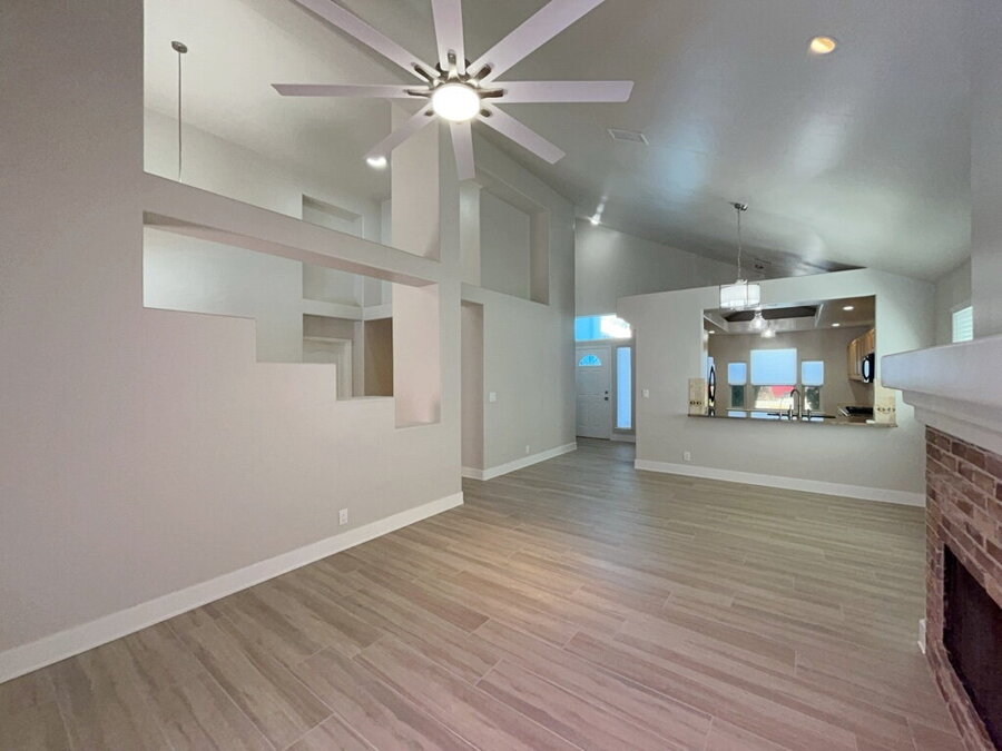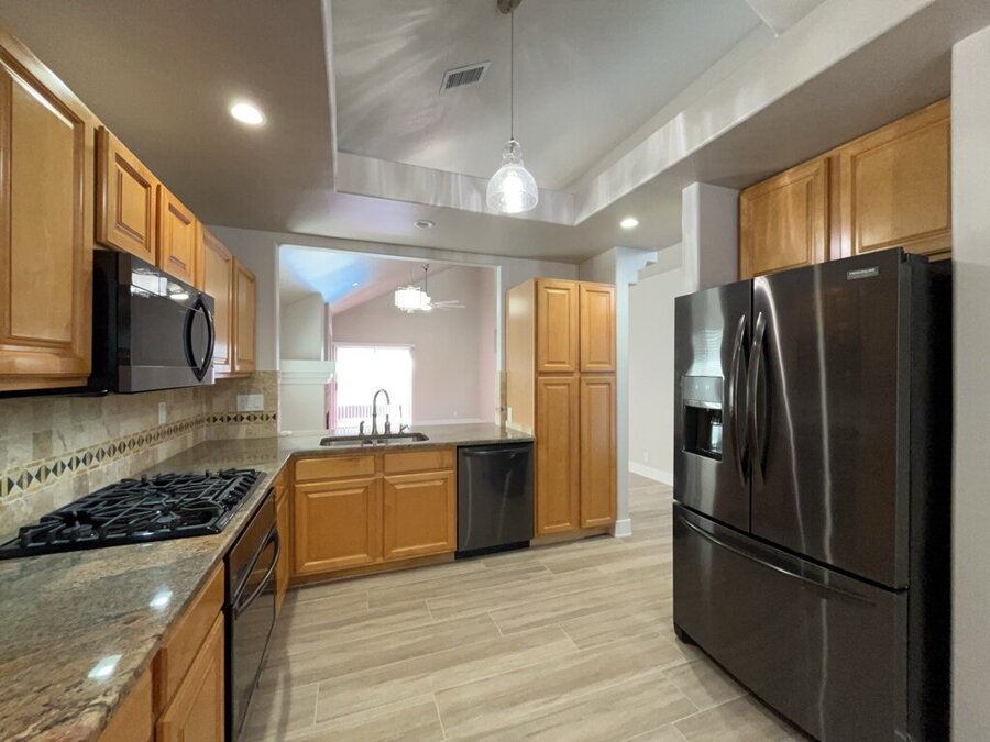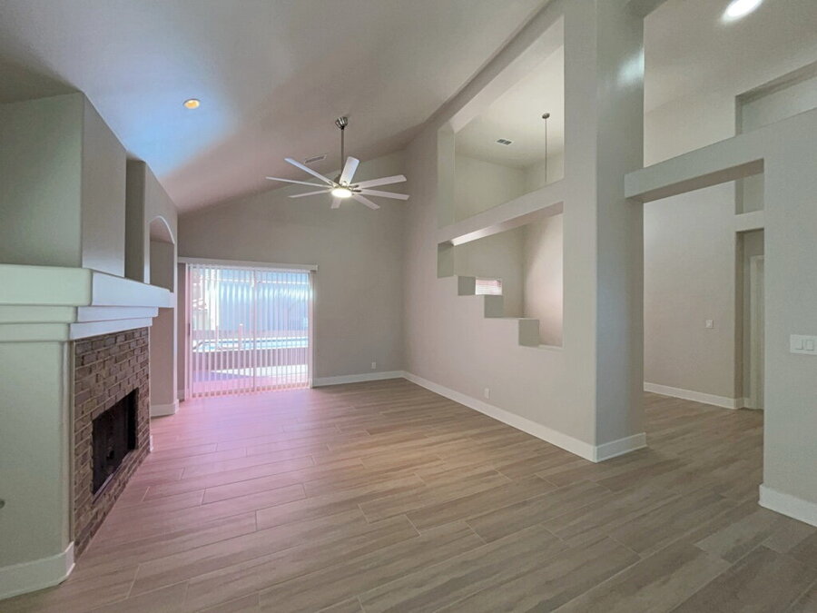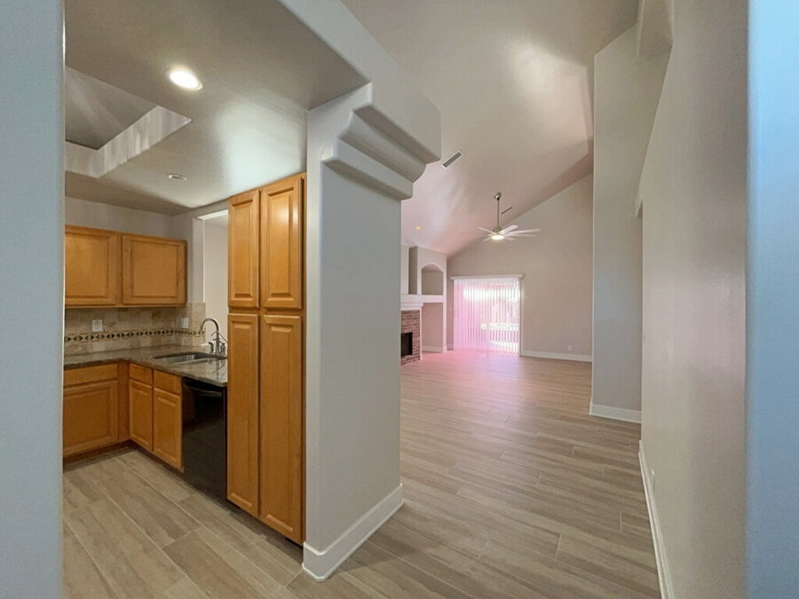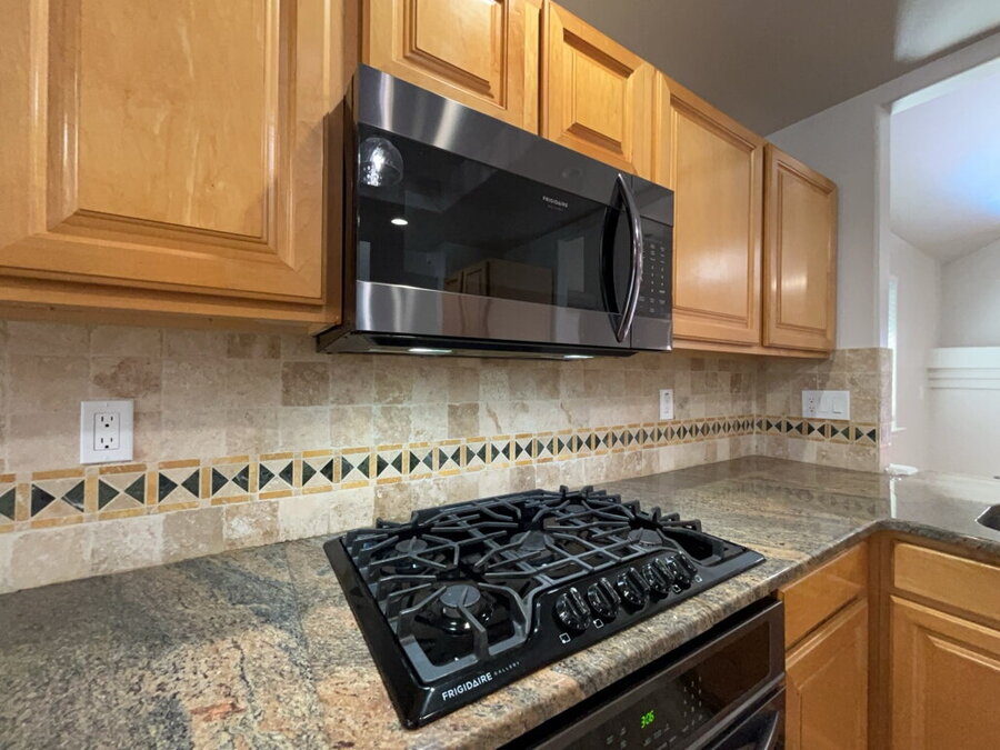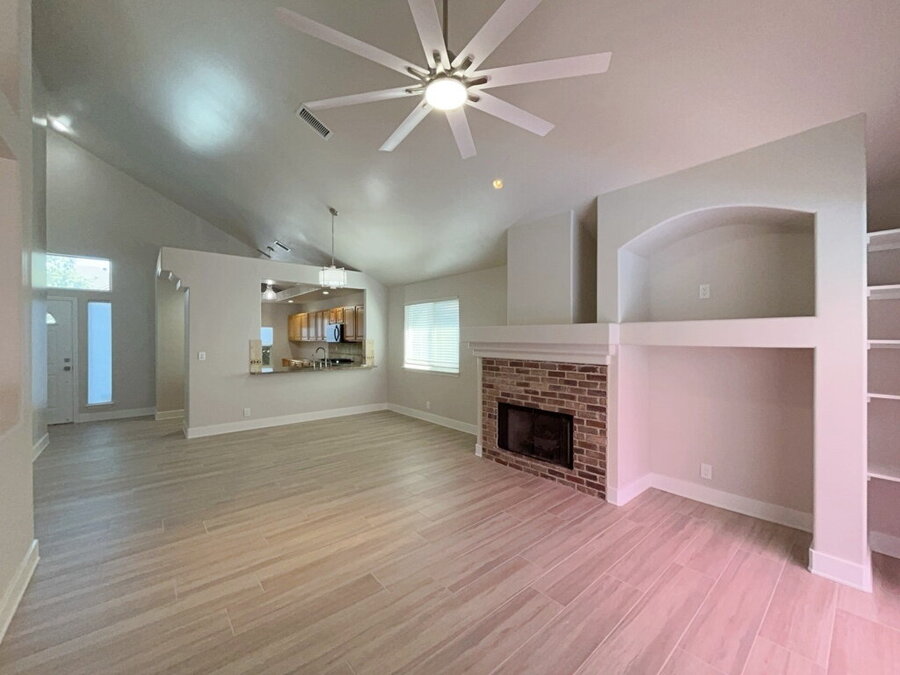 Inside, you’ll find durable ceramic tile flooring throughout and striking high, vaulted ceilings that add a bright, open feel. The living space features a cozy fireplace and is complemented by low energy-efficient windows and a programmable thermostat to keep things comfortable year-round. The kitchen is well-equipped with solid countertops, a gas cooktop, oven, microwave, dishwasher, refrigerator and a breakfast bar, plus a casual eat-in area that makes meals easy and enjoyable.