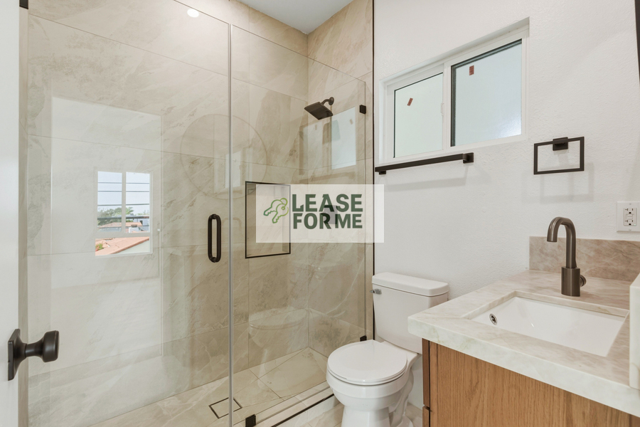 The home features a sleek kitchenette with a brand-new integrated cooktop and microwave, along with an upgraded bathroom highlighted by a beautifully redesigned walk-in shower. Large windows bring in plenty of natural light, creating a bright and inviting living space.