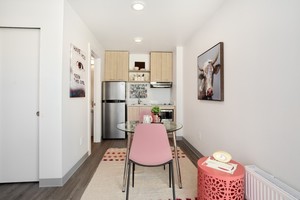 Efficiency studio well equipped for modern living with smart spaces designed to maximize every bit of square footage. These modern units feature a full kitchen that includes a stove top, microwave, refrigerator/freezer and plenty of cabinet space. Each unit comes with a Built in Murphy Bed (that fits a full-size mattress), Closet, Built in Table, Cabinetry, and a Full Bathroom. With the convenience of on-site laundry, additional storage, and bike storage, our building ensures that every aspect of your living experience is thoughtfully catered to. If looking to host friends, or wanting more space to spread out in, we have a lovely, comfortable community room that all our residents can take advantage of.