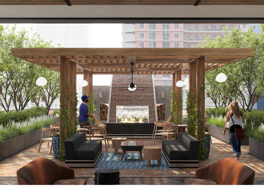 Access to Outdoor Deck with Fireplaces, Kitchen, Dining, Trellis, Daybeds and Lounge Seating