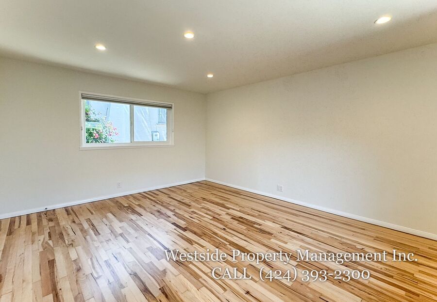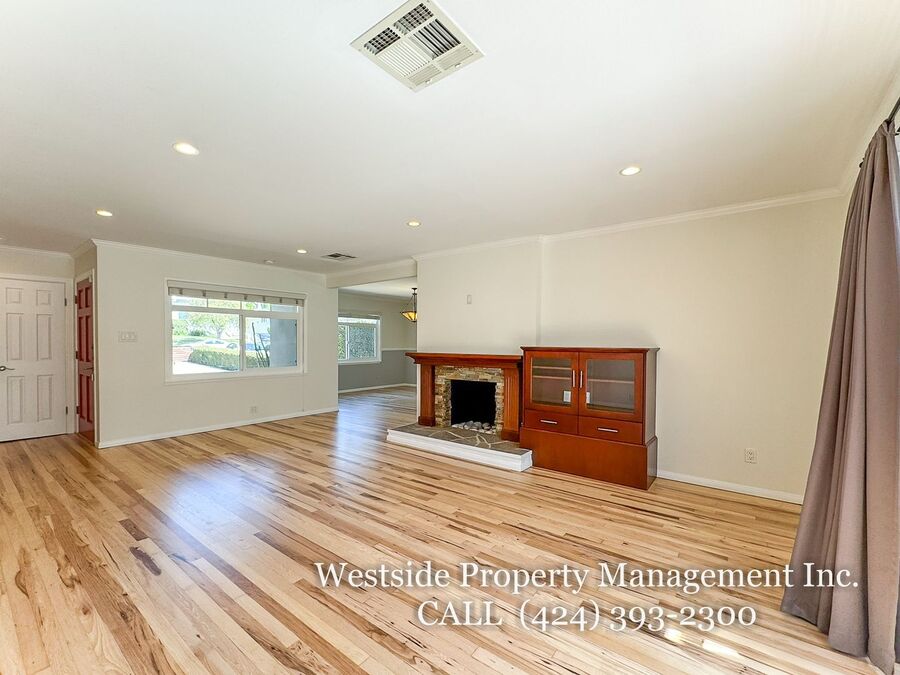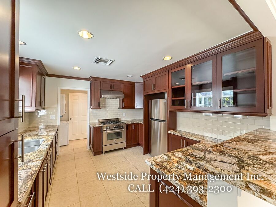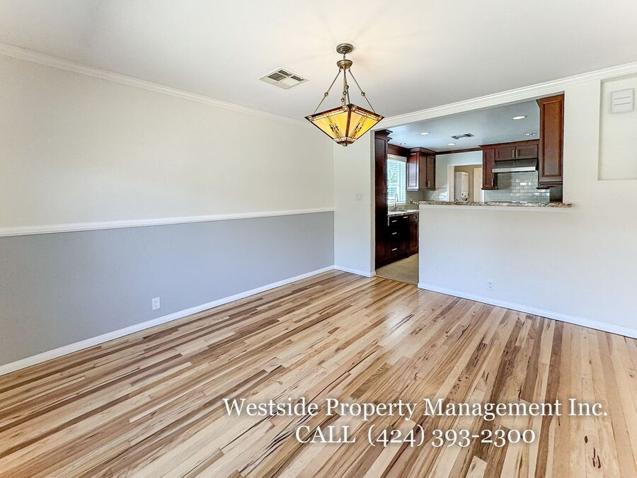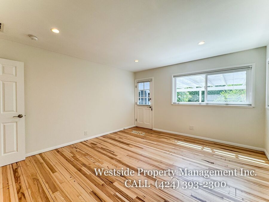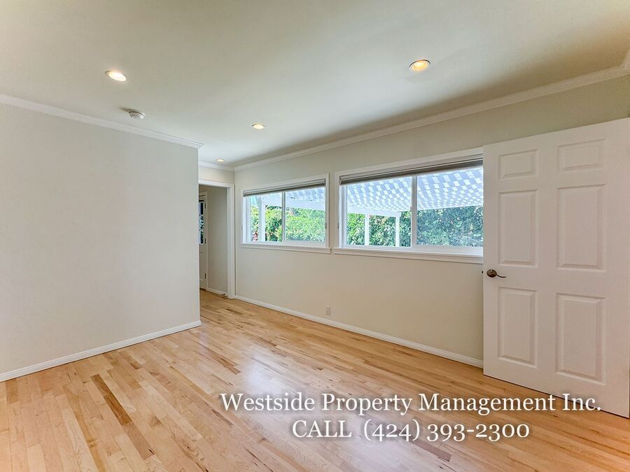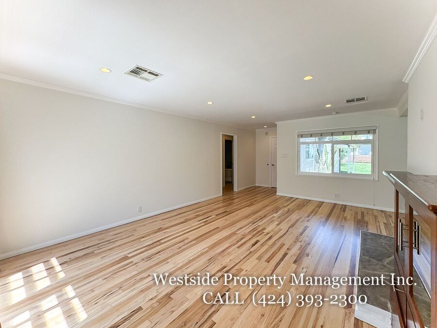 Located in Santa Monica’s coveted 90403 zip code, this beautifully appointed single-story residence offers a refined living space, featuring 3 bedrooms and 2 thoughtfully designed bathrooms. A welcoming entry opens into a light-filled living room, where expansive windows frame lush, mature greenery and fill the space with natural light. Light hardwood flooring and recessed lighting carry throughout, creating a warm yet sophisticated ambiance. The living room flows effortlessly into the dining area, establishing an ideal setting for both relaxed living and elegant entertaining. The adjacent kitchen is both stylish and functional, featuring rich espresso cabinetry, granite countertops, a subway tile backsplash, and stainless steel appliances, including a gas range and full-size refrigerator. A peninsula connects the kitchen to the dining space with pendant lighting, offering a natural gathering point for casual meals and conversation. A discreet laundry area with a stacked washer and dryer adds everyday convenience. The primary suite is generously proportioned and serves as a private retreat, complete with a spa-inspired en suite bathroom featuring a soaking tub and separate shower. Just off the primary bedroom, a versatile bonus room offers the perfect space for a home office, sitting area, nursery, or private fitness studio, enhancing both functionality and luxury. Additional bedrooms are spacious and well-appointed, featuring hardwood flooring, recessed lighting, and ample closet space. Two bedrooms are situated on one side of the home, sharing a well-designed bathroom with a soaking tub, ideal for family or guests. Throughout the home, both bathrooms showcase elevated finishes and distinct character, including a freestanding soaking tub framed by sage green subway tile and another with a glass-enclosed shower, dark wood vanity, and granite countertops, complemented by tile flooring.