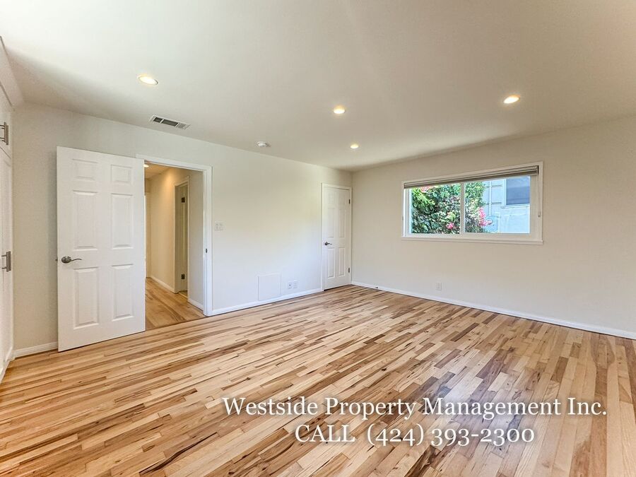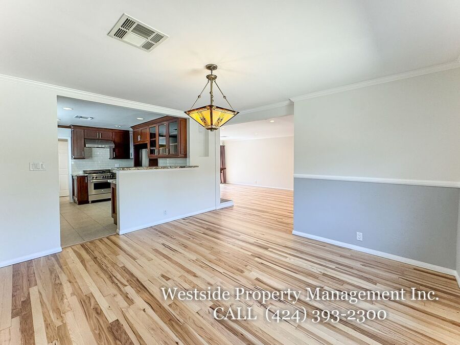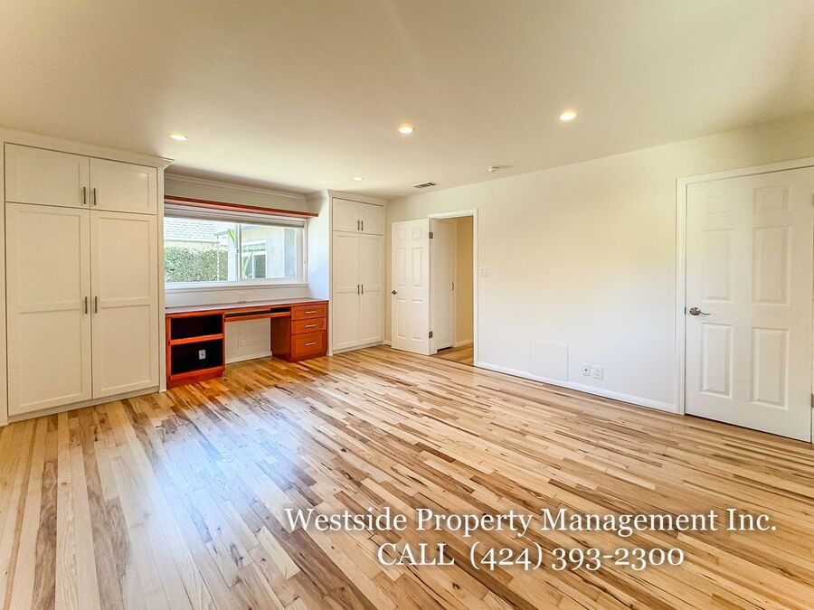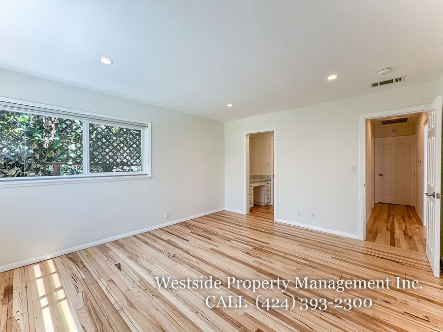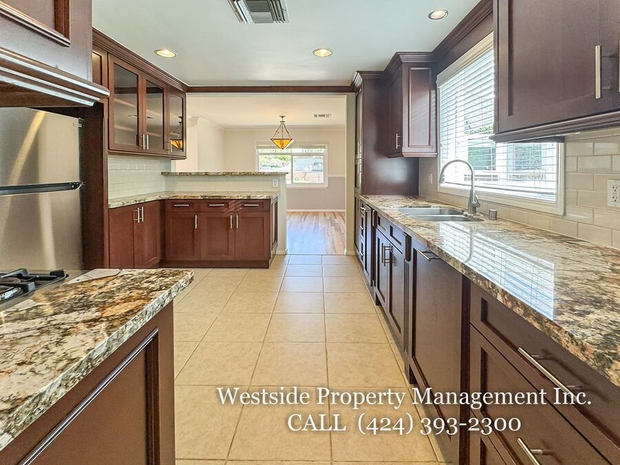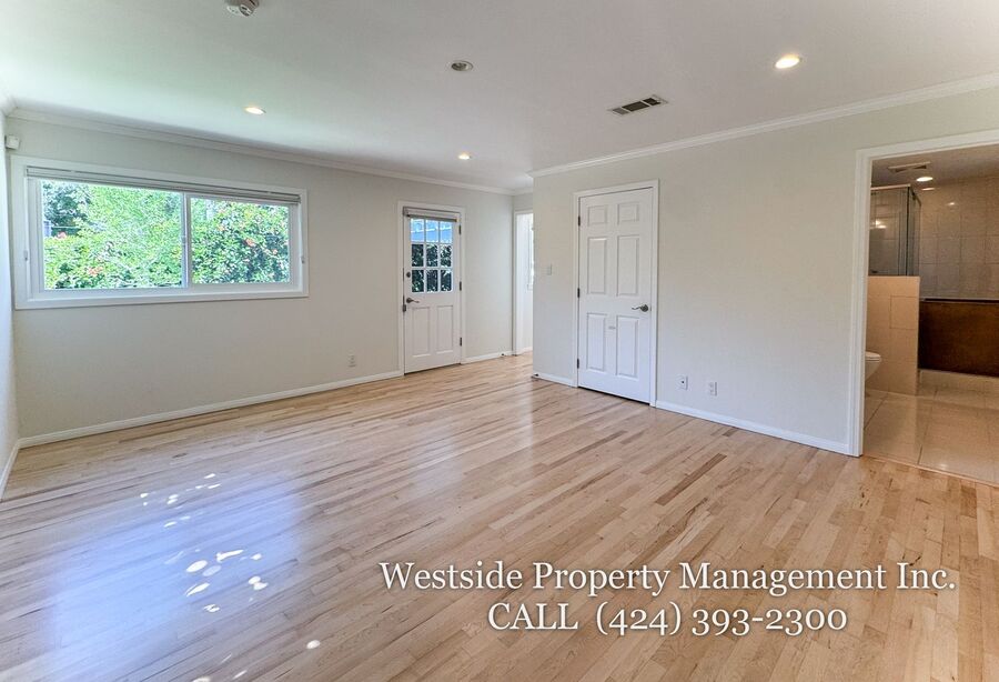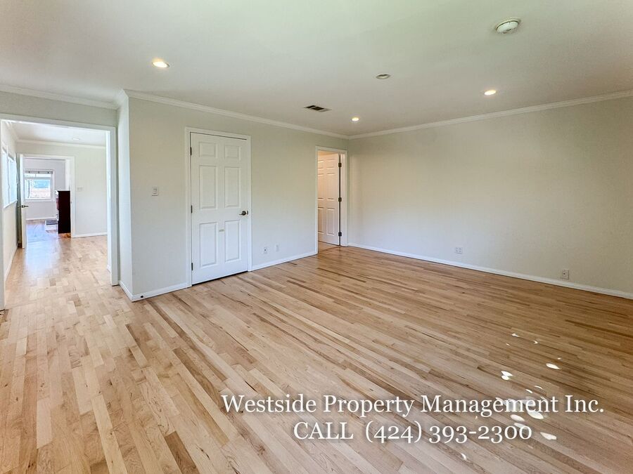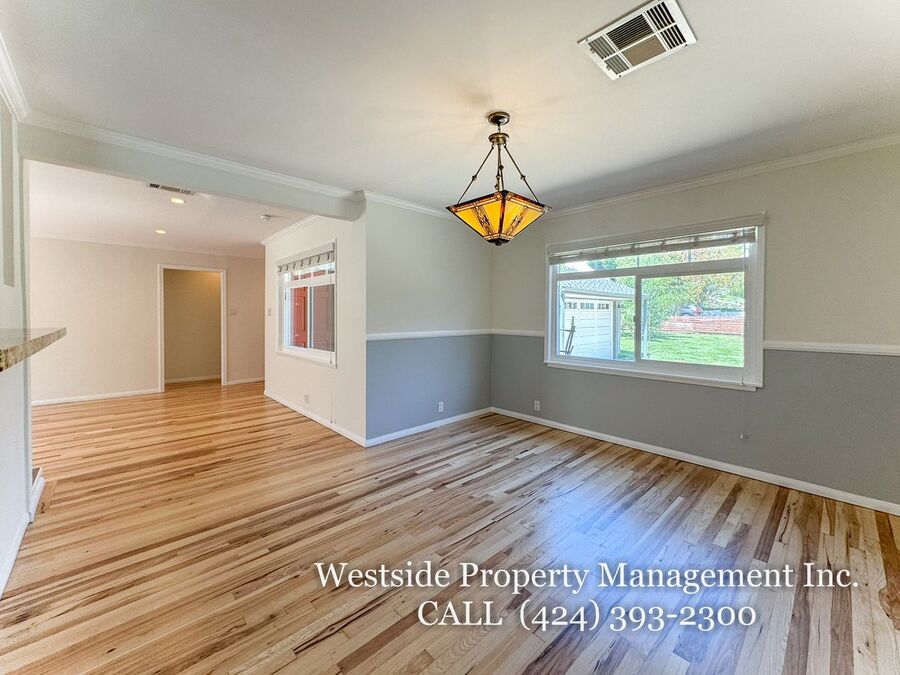 Located in Santa Monica’s coveted 90403 zip code, this beautifully appointed single-story residence offers a refined living space, featuring 3 bedrooms and 2 thoughtfully designed bathrooms. A welcoming entry opens into a light-filled living room, where expansive windows frame lush, mature greenery and fill the space with natural light. Light hardwood flooring and recessed lighting carry throughout, creating a warm yet sophisticated ambiance. The living room flows effortlessly into the dining area, establishing an ideal setting for both relaxed living and elegant entertaining. The adjacent kitchen is both stylish and functional, featuring rich espresso cabinetry, granite countertops, a subway tile backsplash, and stainless steel appliances, including a gas range and full-size refrigerator. A peninsula connects the kitchen to the dining space with pendant lighting, offering a natural gathering point for casual meals and conversation. A discreet laundry area with a stacked washer and dryer adds everyday convenience. The primary suite is generously proportioned and serves as a private retreat, complete with a spa-inspired en suite bathroom featuring a soaking tub and separate shower. Just off the primary bedroom, a versatile bonus room offers the perfect space for a home office, sitting area, nursery, or private fitness studio, enhancing both functionality and luxury. Additional bedrooms are spacious and well-appointed, featuring hardwood flooring, recessed lighting, and ample closet space. Two bedrooms are situated on one side of the home, sharing a well-designed bathroom with a soaking tub, ideal for family or guests. Throughout the home, both bathrooms showcase elevated finishes and distinct character, including a freestanding soaking tub framed by sage green subway tile and another with a glass-enclosed shower, dark wood vanity, and granite countertops, complemented by tile flooring.