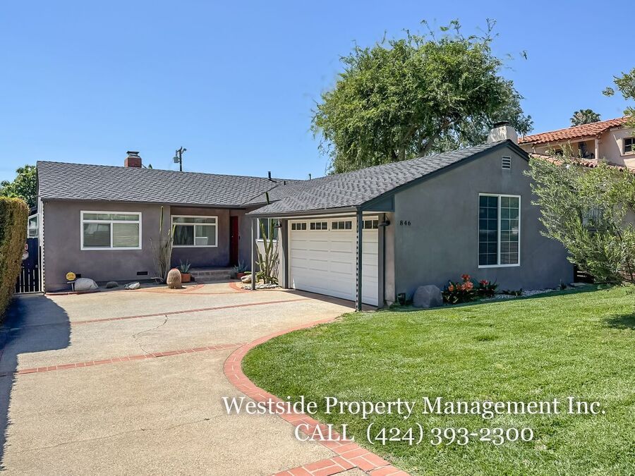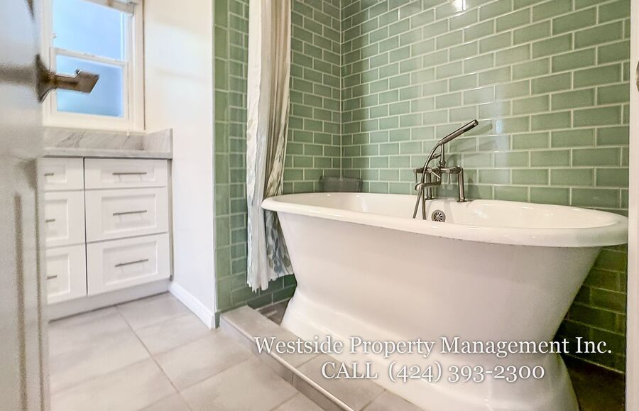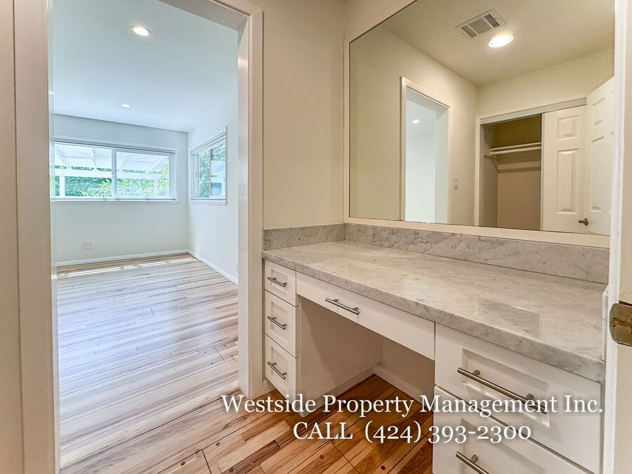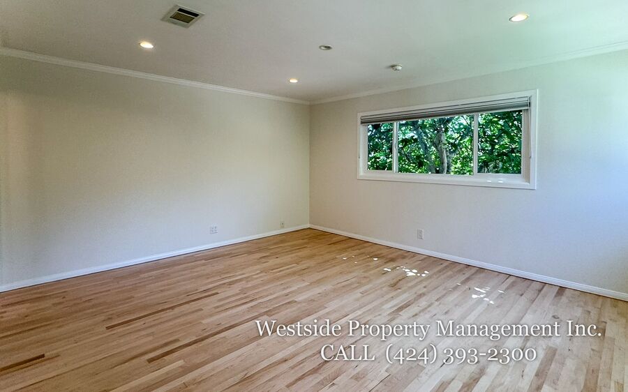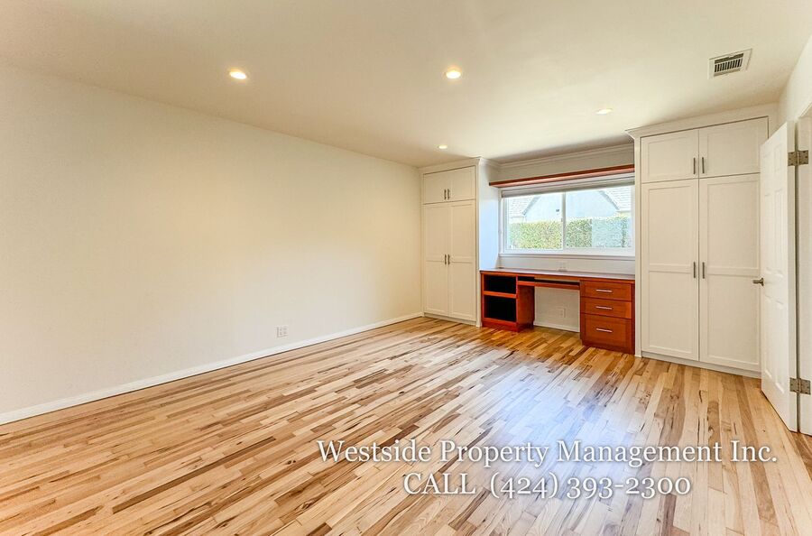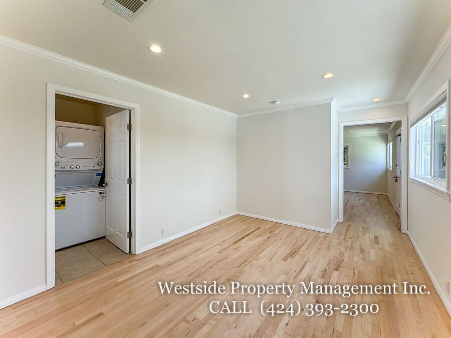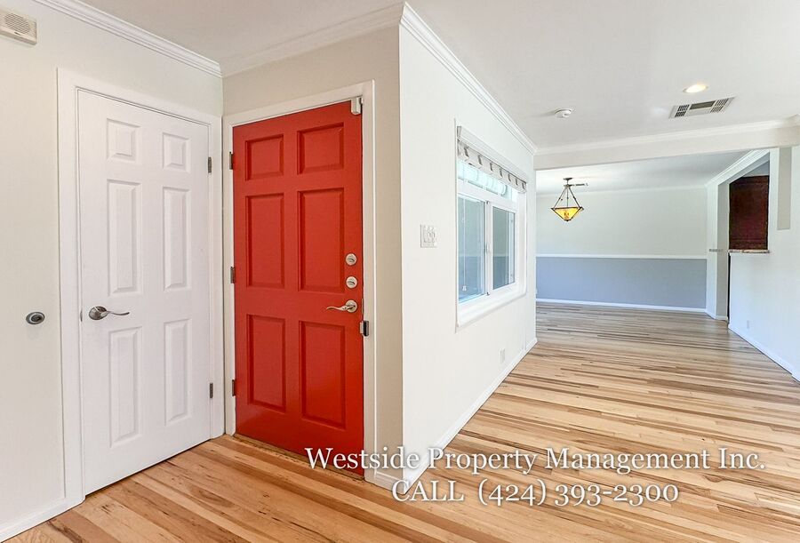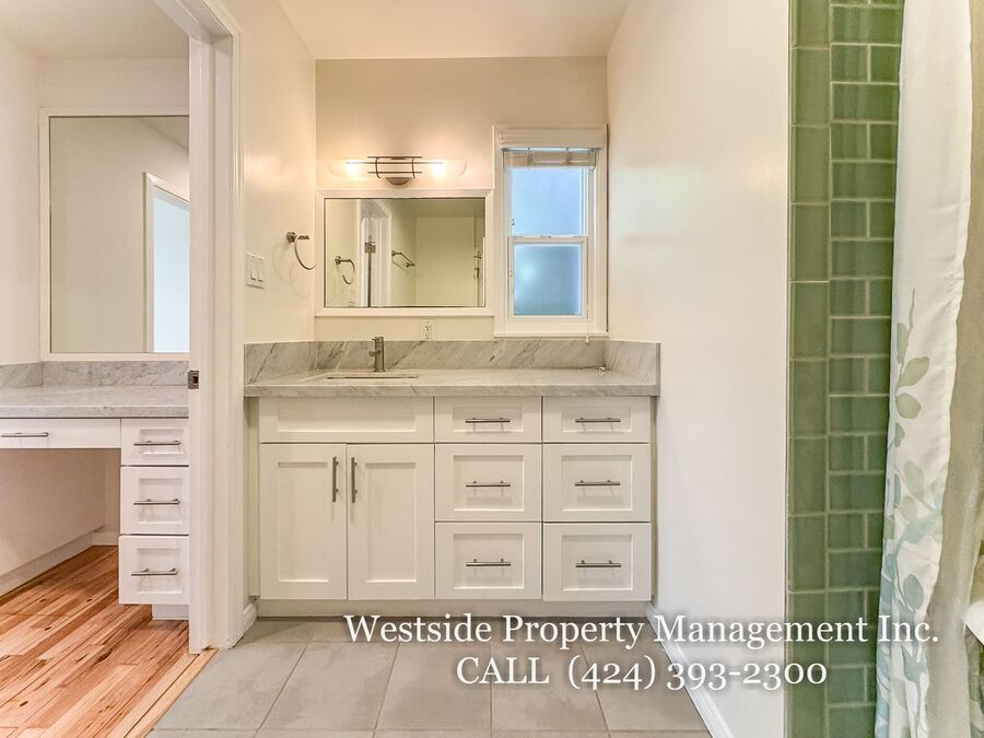 Located in Santa Monica’s coveted 90403 zip code, this beautifully appointed single-story residence offers a refined living space, featuring 3 bedrooms and 2 thoughtfully designed bathrooms. A welcoming entry opens into a light-filled living room, where expansive windows frame lush, mature greenery and fill the space with natural light. Light hardwood flooring and recessed lighting carry throughout, creating a warm yet sophisticated ambiance. The living room flows effortlessly into the dining area, establishing an ideal setting for both relaxed living and elegant entertaining. The adjacent kitchen is both stylish and functional, featuring rich espresso cabinetry, granite countertops, a subway tile backsplash, and stainless steel appliances, including a gas range and full-size refrigerator. A peninsula connects the kitchen to the dining space with pendant lighting, offering a natural gathering point for casual meals and conversation. A discreet laundry area with a stacked washer and dryer adds everyday convenience. The primary suite is generously proportioned and serves as a private retreat, complete with a spa-inspired en suite bathroom featuring a soaking tub and separate shower. Just off the primary bedroom, a versatile bonus room offers the perfect space for a home office, sitting area, nursery, or private fitness studio, enhancing both functionality and luxury. Additional bedrooms are spacious and well-appointed, featuring hardwood flooring, recessed lighting, and ample closet space. Two bedrooms are situated on one side of the home, sharing a well-designed bathroom with a soaking tub, ideal for family or guests. Throughout the home, both bathrooms showcase elevated finishes and distinct character, including a freestanding soaking tub framed by sage green subway tile and another with a glass-enclosed shower, dark wood vanity, and granite countertops, complemented by tile flooring.