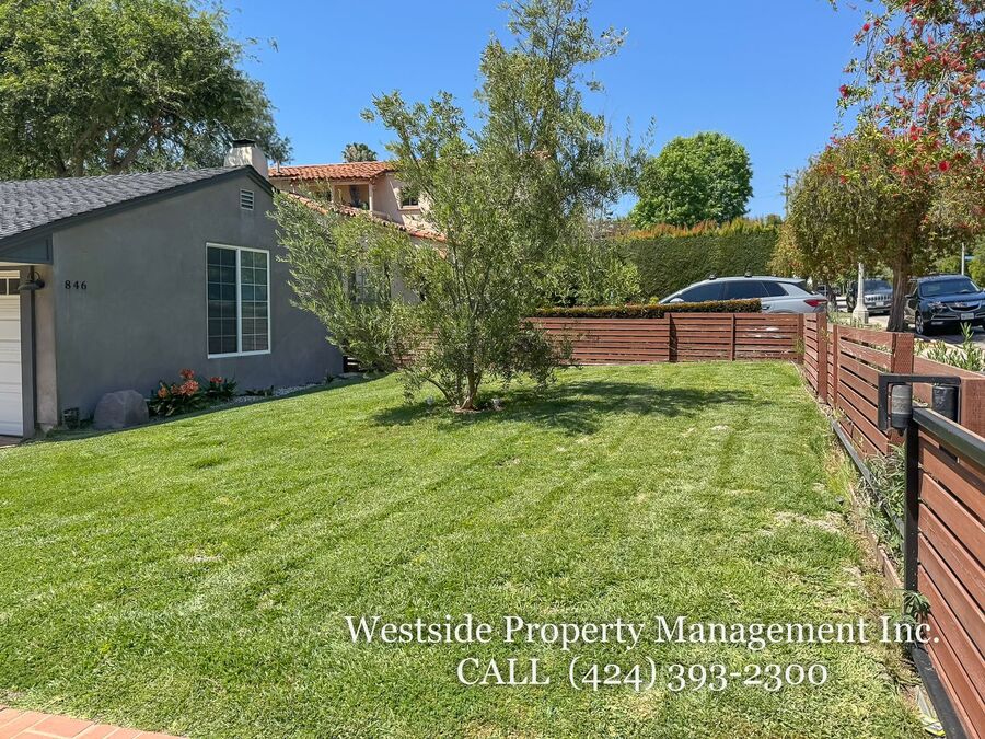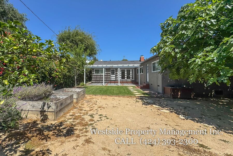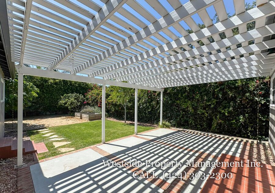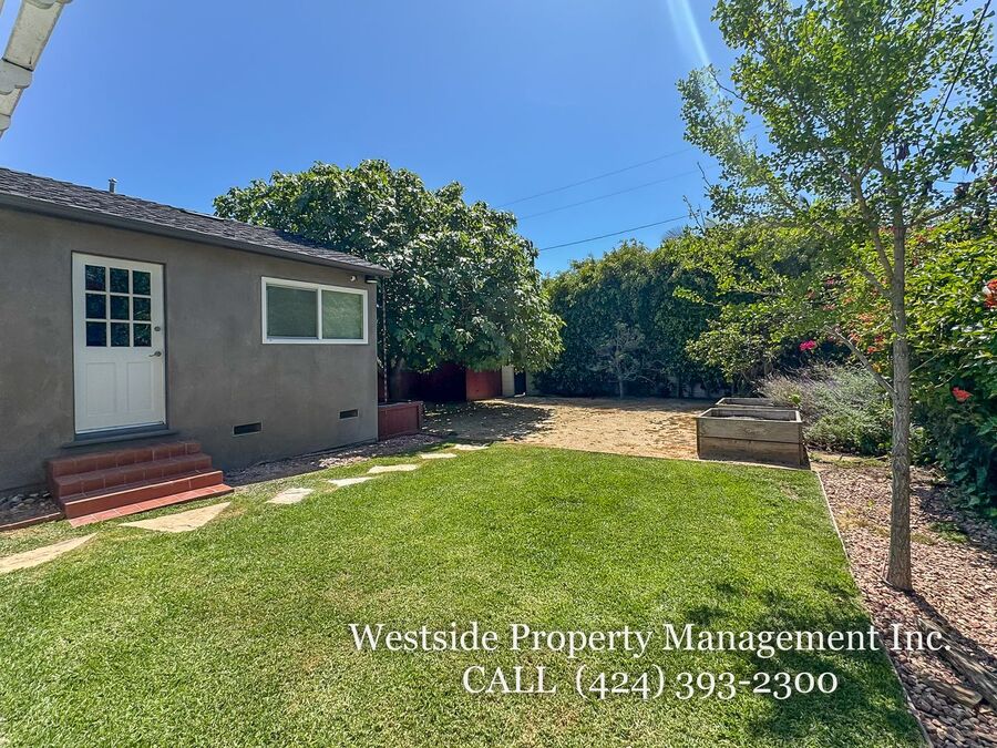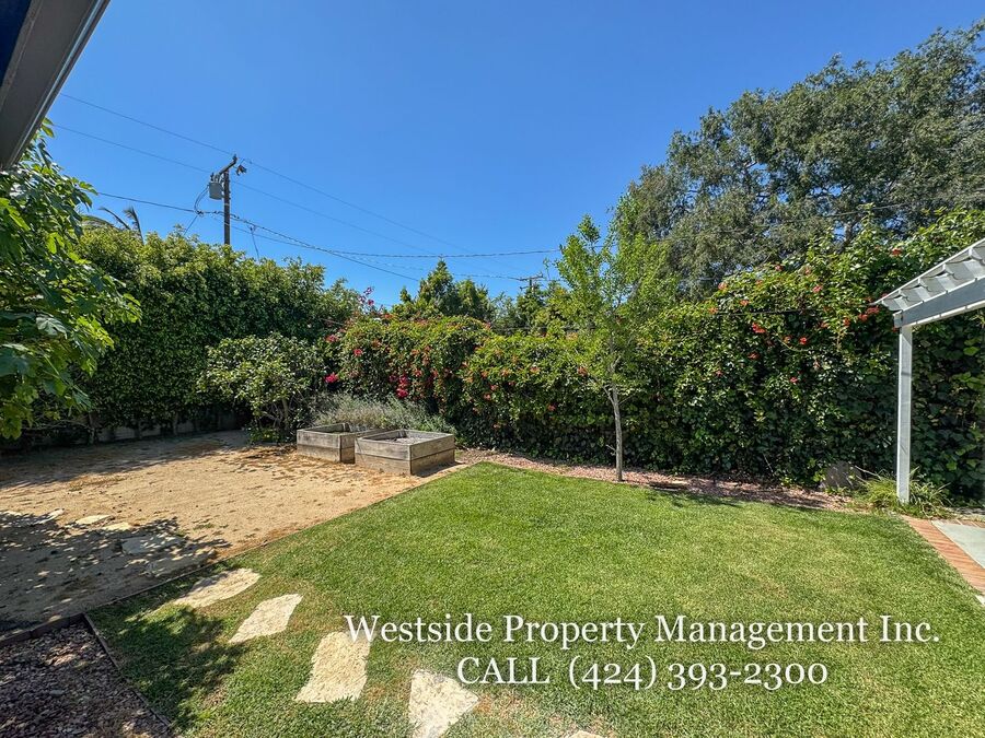 The expansive backyard offers a serene outdoor retreat, complete with a trellis-covered patio ideal for dining or lounging, a grassy area, and mature trees that provide both beauty and privacy. The property also includes a private garage along with additional driveway parking for added convenience. Blending timeless finishes with modern comfort, this residence offers an exceptional living experience in one of Santa Monica’s most desirable neighborhoods.