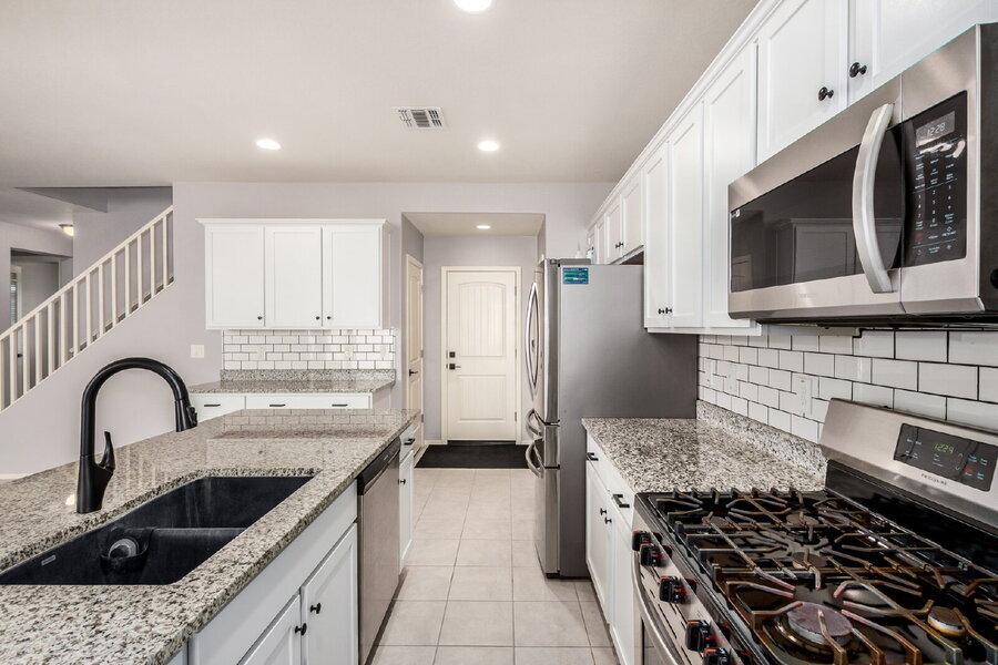 Absolutely amazing home located in a beautiful, in highly desirable gated community. This home is 2176 square feet, features 4 bedrooms, and 2.5 bathrooms and has SOLAR for low electric bills. One bedroom is downstairs, three other bedrooms and a loft upstairs. The Kitchen has granite counter tops beautiful subway tile back splash and a gas range. All appliances are included, refrigerator, washer and dryer. The Primary Bedroom has an amazing custom-designed walk-in closet. Spectacular mountain views from the back yard and Primary Bedroom window. The backyard is fenced and has grass and a large, covered patio. Well maintained home with neutral two-tone paint, two car garage and 3 car driveway. No added or hidden monthly fees, just rent. The owner pays the HOA dues. The tenant is responsible for all other utilities.Washer/Dryer In Unit