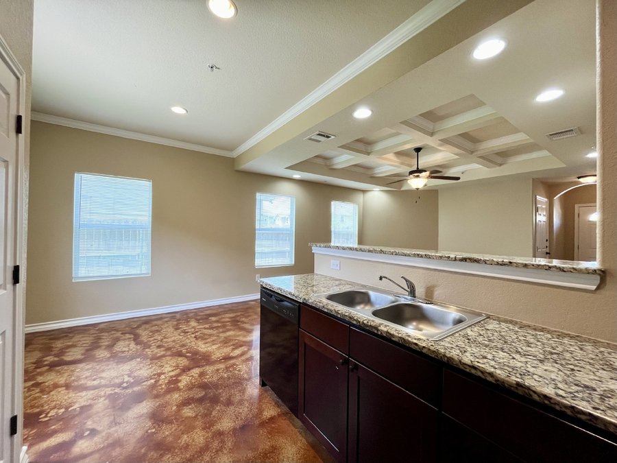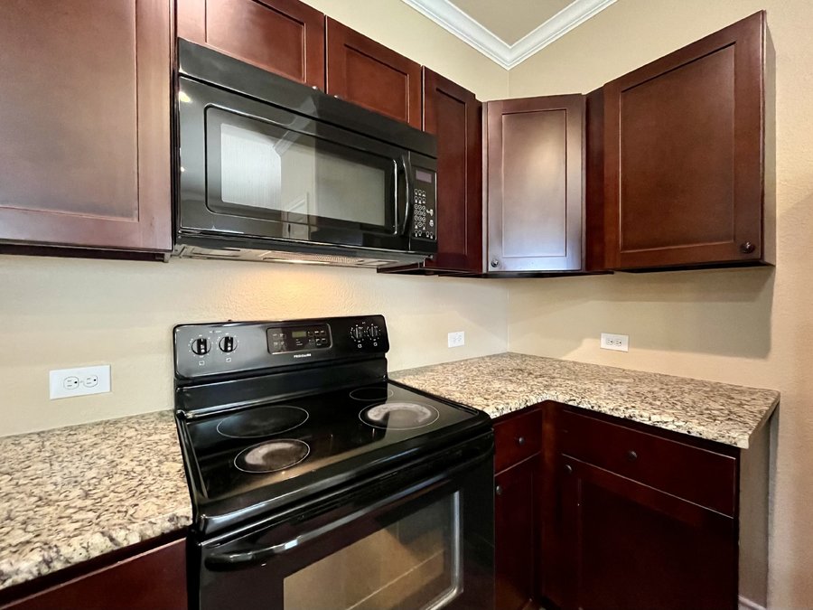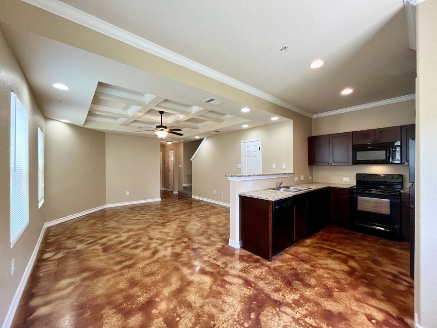 The kitchen is a focal point, equipped with a breakfast bar, dishwasher, microwave, refrigerator, stove/range, and solid countertops, offering functionality and style for culinary enthusiasts.