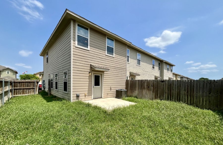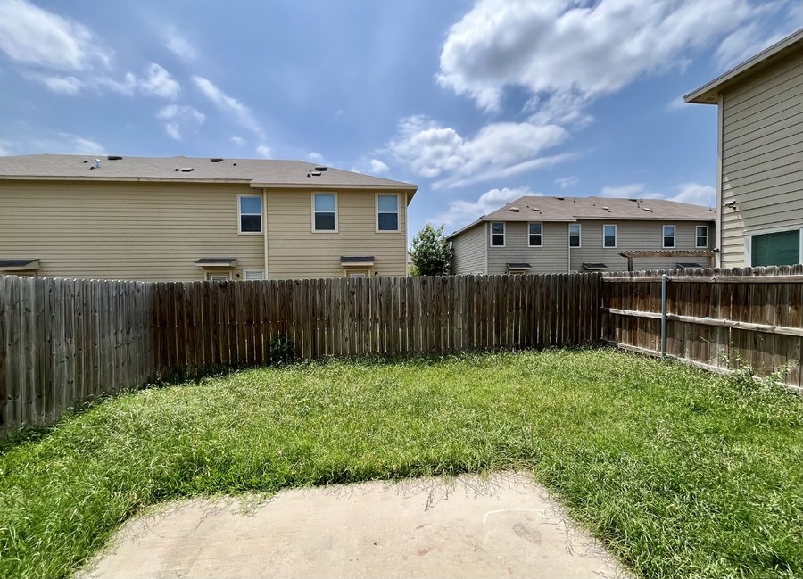 Outside, the smaller backyard boasts a patio and a privacy fence, creating a cozy outdoor space for relaxation and outdoor gatherings.
