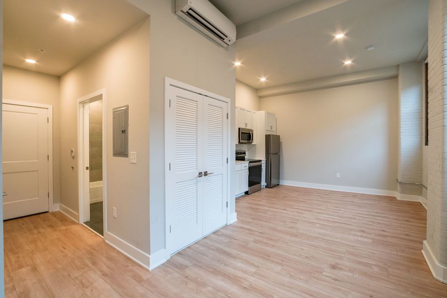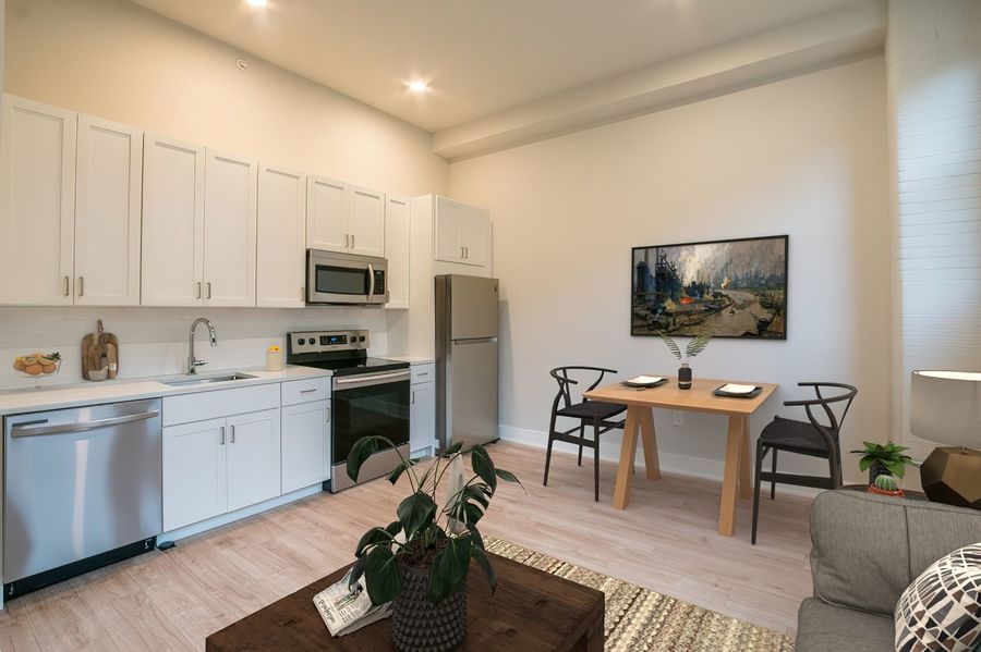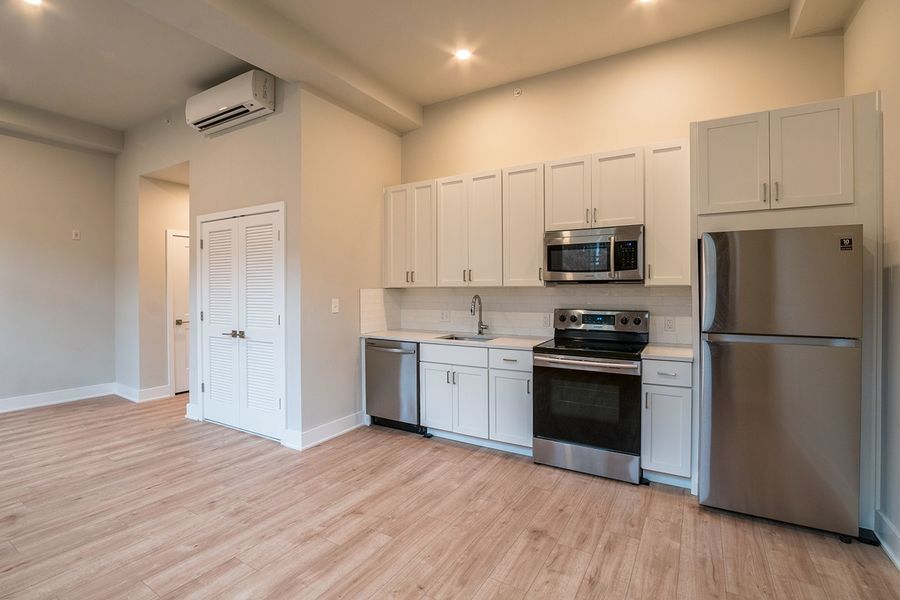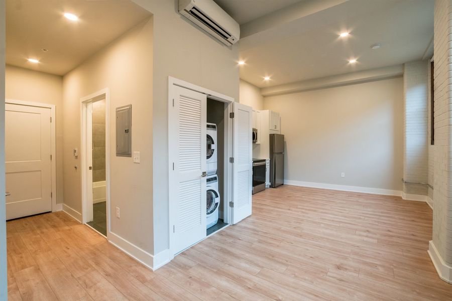Don't miss this breathtaking studio, 1 bathroom apartment within the historic Smith School building! This unit has everything: hardwood floors, mini split system heating/cooling, recessed lighting, washer/dryer in unit and massive windows! The kitchen has white cabinets with sleek hardware against textured white subway tile back splash, quartz counter tops, a garbage disposal and stainless steel dishwasher, microwave, refrigerator and electric range. The bathroom features a vanity with the same counter tops that match the kitchen and a shower/tub.