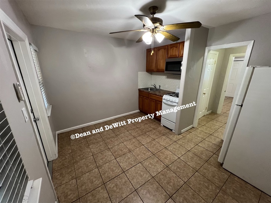 Kitchen: Newer white gas range, over-range microwave, refrigerator