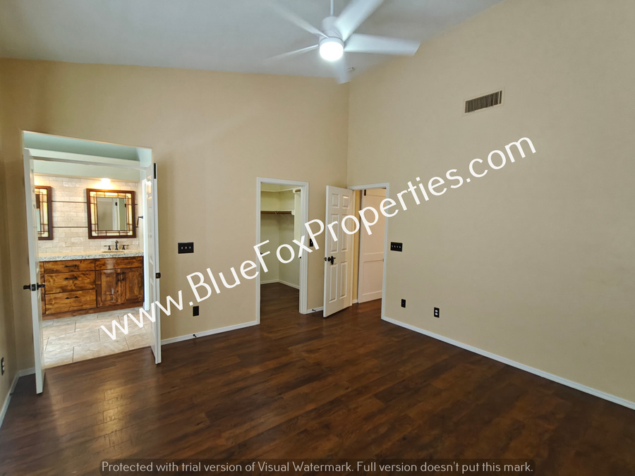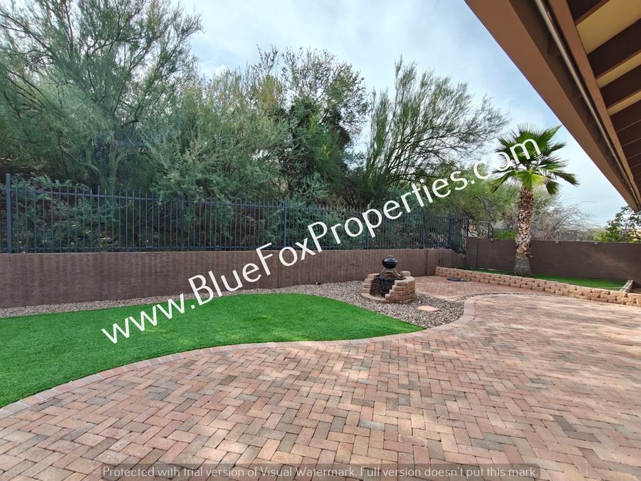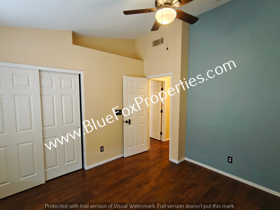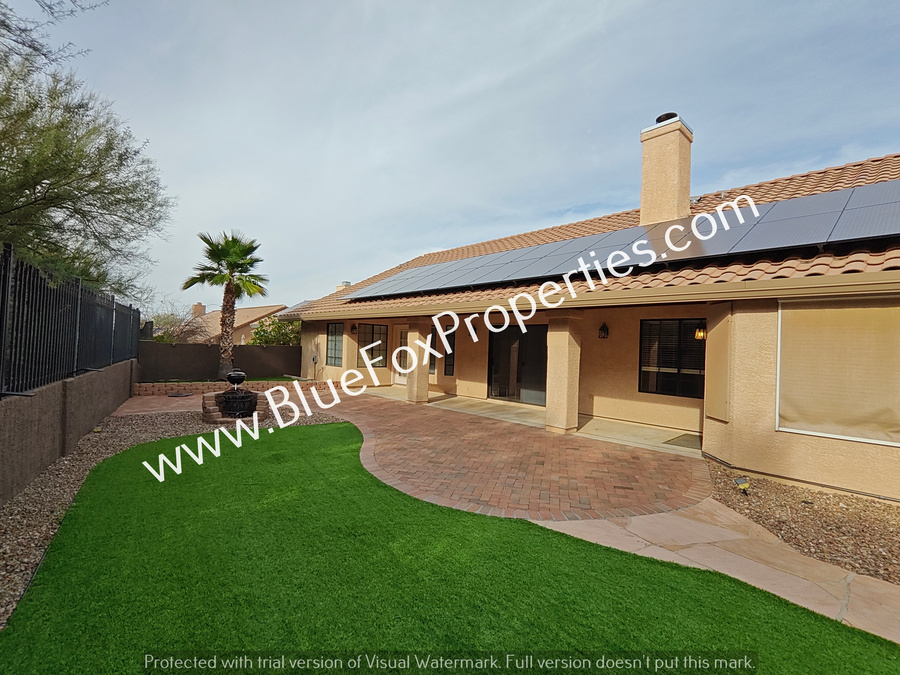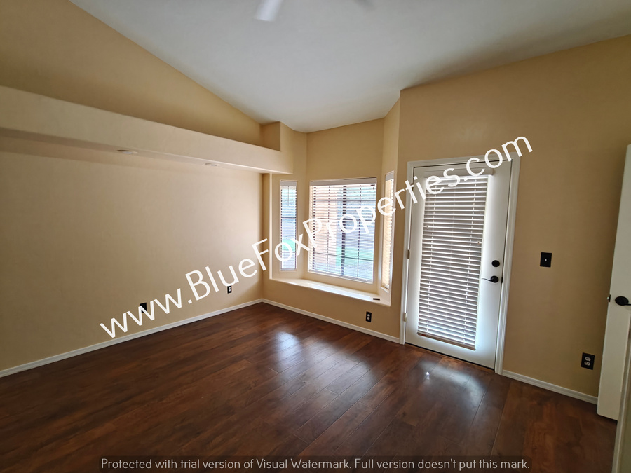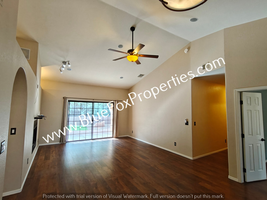This beautiful home in Desert Mirage at La Reserve offers charming desert landscaping and a welcoming front porch, leading into a bright, spacious interior with vaulted ceilings, hardwood floors, ceiling fans, and abundant natural light. The expansive great room features an oversized sliding door opening to the back patio and a two-way fireplace shared with the family and breakfast area. The kitchen is equipped with wood cabinetry, stainless steel appliances, granite countertops, and an island with a breakfast bar. The primary suite includes private outdoor access, a walk-in closet, recessed lighting, and a dual-sink bathroom. Additional highlights include a two-car garage with a laundry area, built-in cabinets, and a garage freezer for tenant use. The backyard is designed for entertaining with a covered patio, pavers, artificial turf, and a fire pit, plus the added benefit of owned solar.
