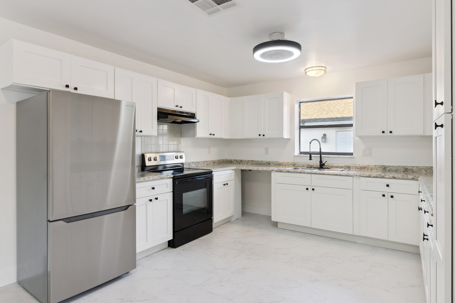 The heart of the home is the brand-new kitchen, featuring all new stainless-steel appliances, including a refrigerator and dishwasher, paired with crisp cabinetry, modern countertops, and an open, functional layout that flows seamlessly into the living and dining areas. Whether you cook daily or entertain often, this kitchen feels fresh, bright, and efficient.